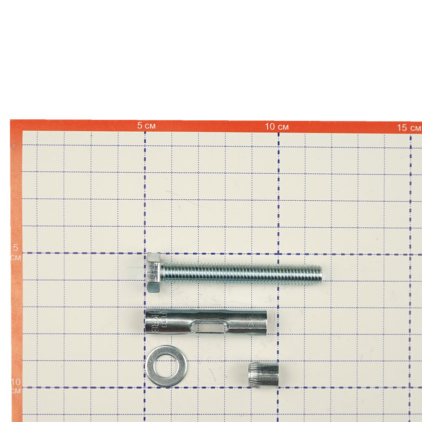 Анкерный болт изготовлен из углеродистой стали холодного формования. Состоит из резьбовой шпильки с конусообразным нижним концом, распорной втулки с продольными боковыми прорезями и гайки, при помощи которой такой болт фиксируется в посадочном отверстии.