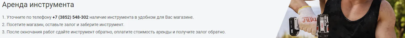 1. Услуга “Аренда инструмента” предоставляется физическим лицам. Для заключения договора на аренду необходимо предоставить документ подтверждающий личность. Сначала вносится стоимость залога, а стоимость аренды оплачивается после возврата инструмента. Минимальный срок аренды - сутки. В случае, если вы хотите оставить взятый в аренду инструмент - услуга не оплачивается, а залог остается у нас.