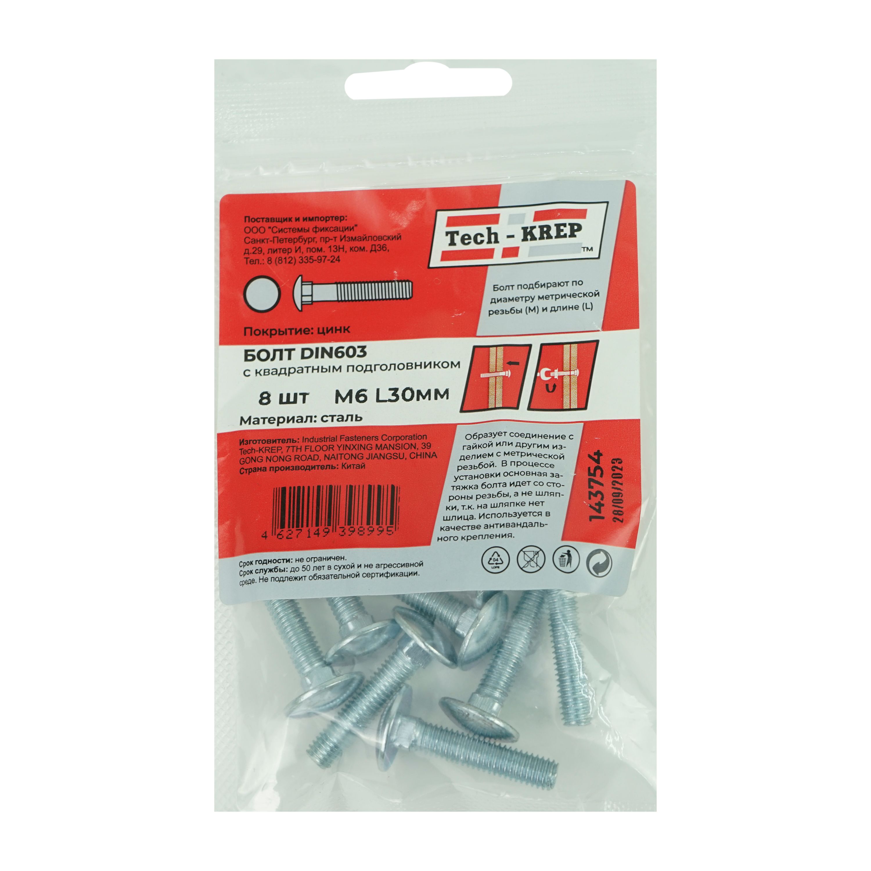 Болт DIN603 с квадратным подголовником оцинкованный М6х30, пакет 8 шт цена - купить в Барнауле, Бийске. Размеры, характеристики, фото в интернет-магазине.