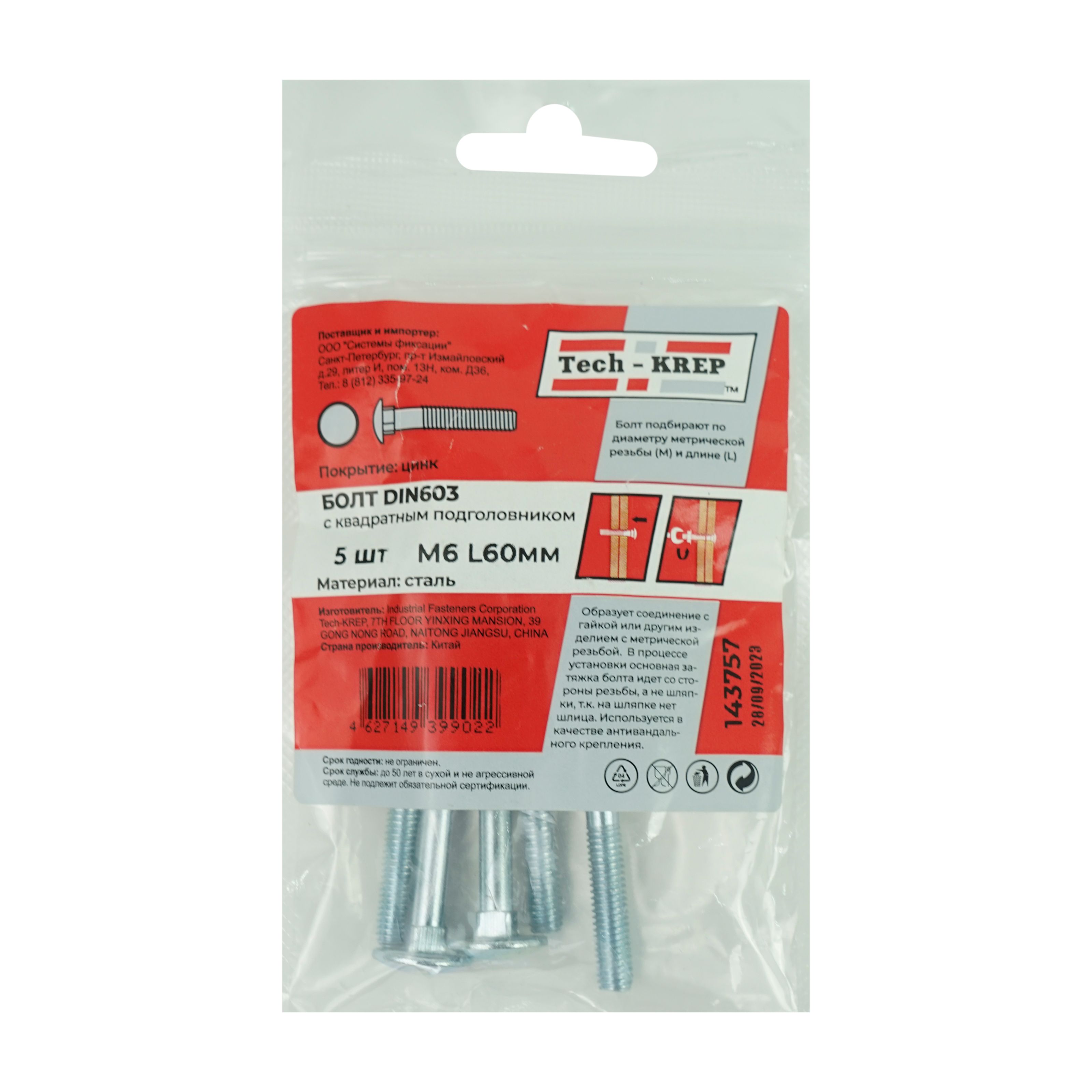За счет подголовника, утопленного в квадратном посадочном месте, болт мебельный не прокручивается в отверстии при затягивании. Широкая низкопрофильная шляпка хорошо прижимает скрепляемые детали, не продавливая поверхность в месте крепления.