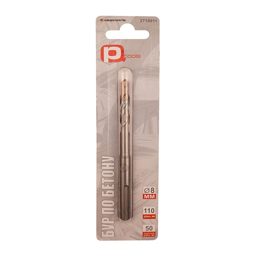 Бур (ПиКьюТулс) по бетону, SDS+, 8х110/50мм - режущий инструмент для проделывания отверстий в основаниях из бетона, кирпича, искусственного и природного камня. Обеспечивает быстрое просверливание отверстий, а также эффективное удаление бетонной пыли и иных продуктов сверления. Усиленная пластина из твердого сплава "ВК8" существенно повышает эффективность сверления, а также увеличивает износостойкость бура в процессе эксплуатации. Используется с патронами, соответствующими стандарту SDS-PLUS.