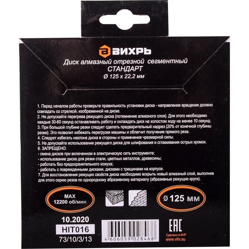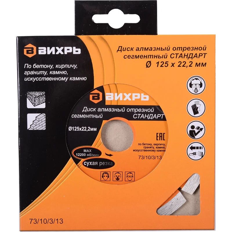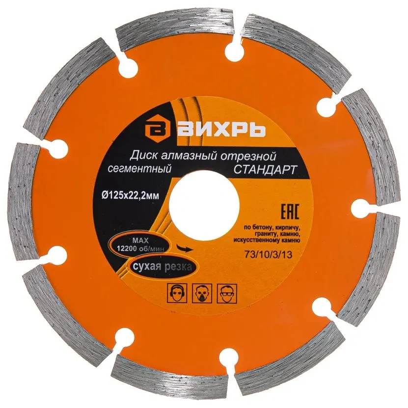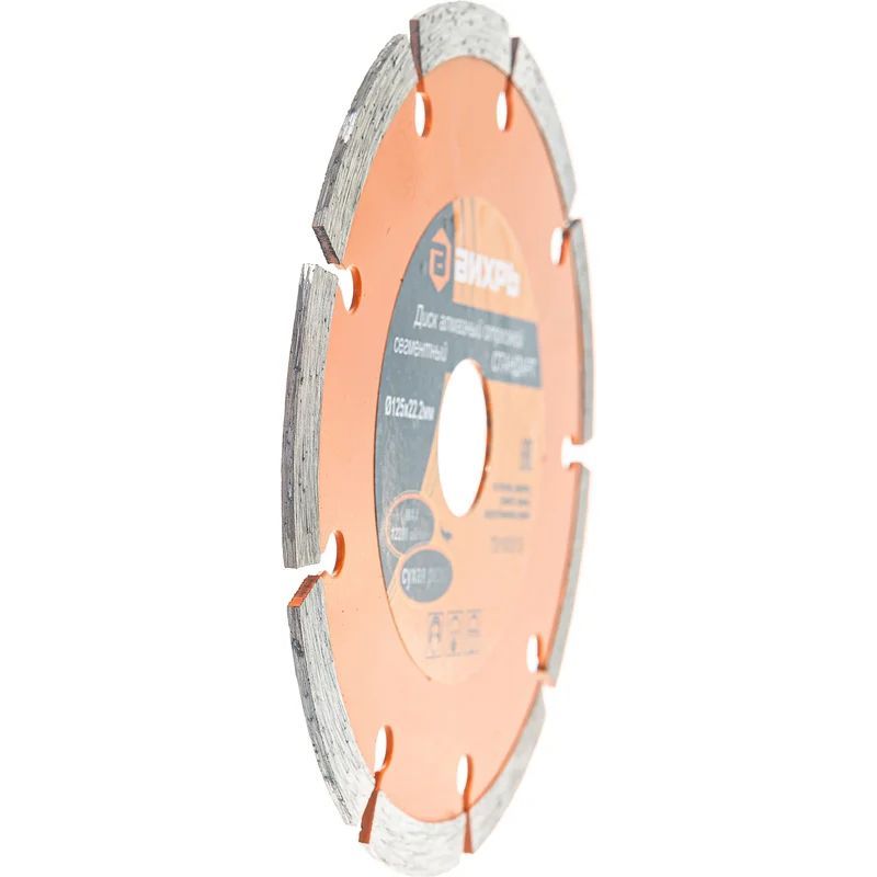 Диск отрезной алмазный сегментированный Вихрь по бетону, кирпичу, камню. Благодаря наличию "прорезей" сегментов в диске, процесс обработки осуществляется с эффективным выбросом продуктов резания. Максимальное число оборотов диска - 12 200 об/мин. Диск имеет посадочный диаметр 22.2 мм и используется для работы с угловыми шлифовальными машинами. Диаметр диска - 125 мм.