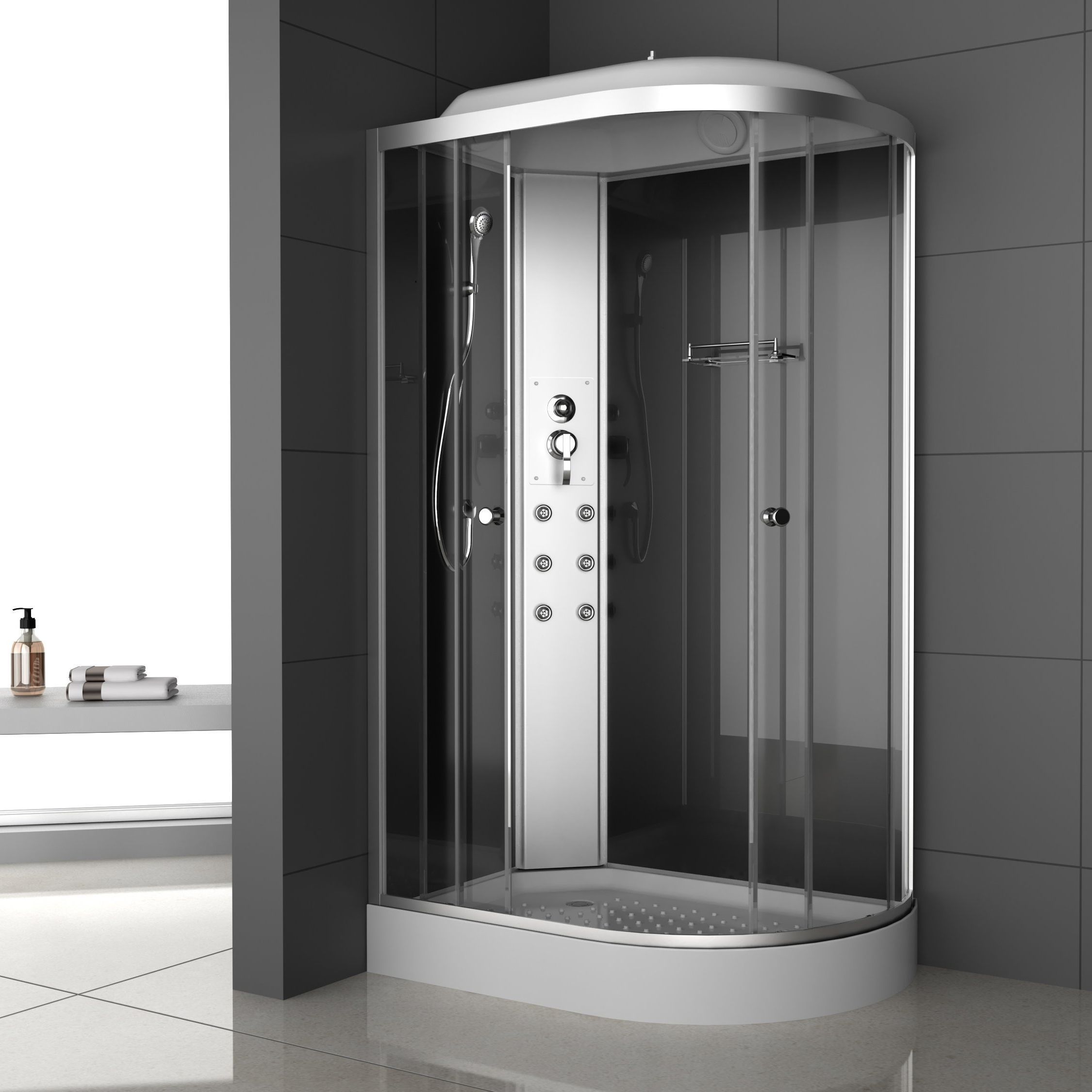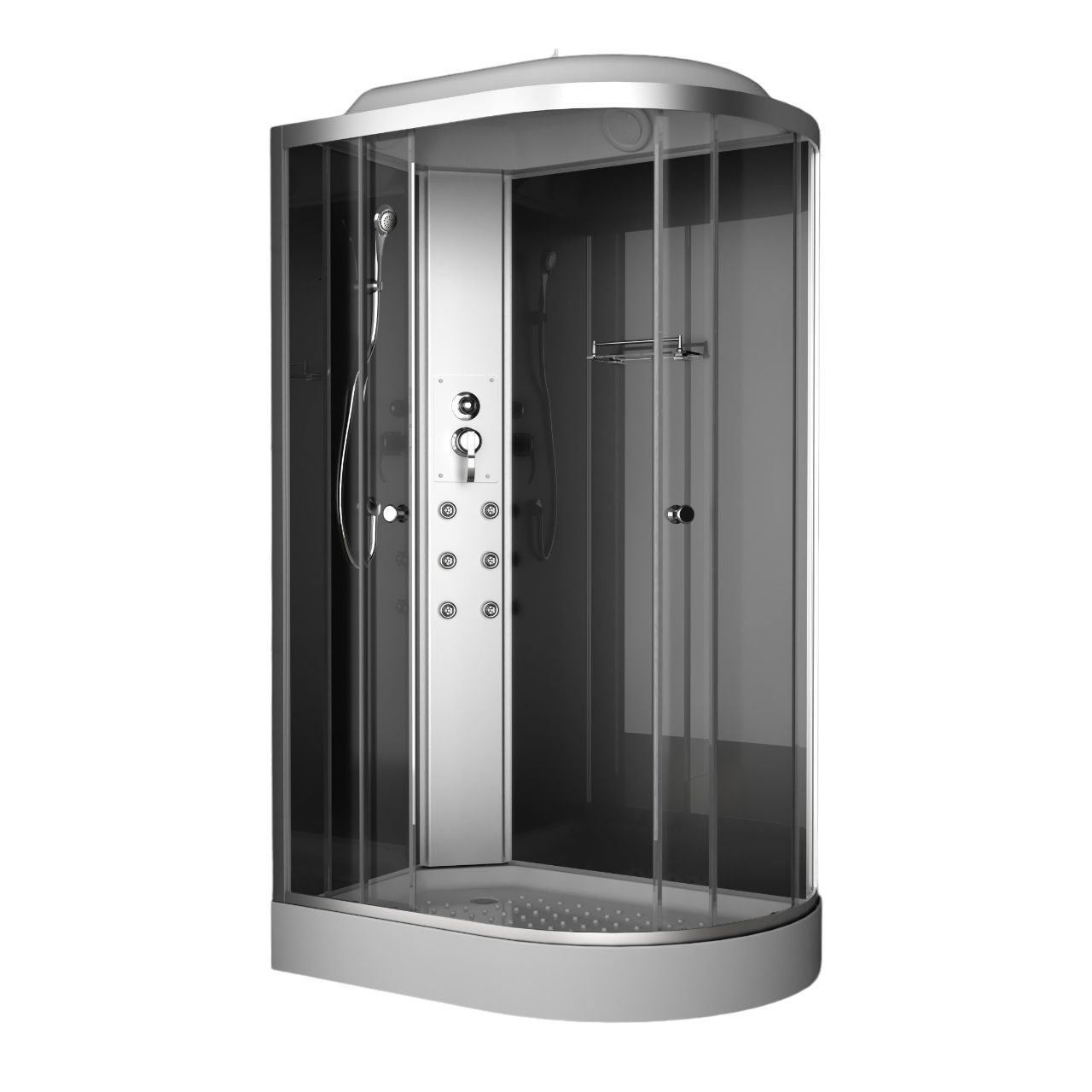 - В качестве функционального оснащения в модели предусмотрены тропический и ручной душ, гидромассаж 6 форсунок, смеситель с тремя режимами, стеклянная полочка и вытяжка.