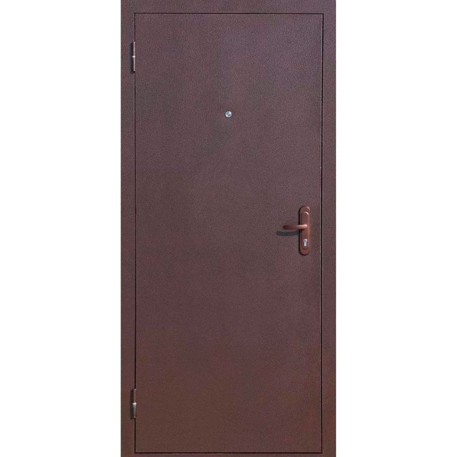 Стальная рама оснащена двумя внешними износоустойчивыми петлями с подшипниками и стационарным порогом. Все изделие с обеих сторон покрыто атмосферостойким порошково-полимерным покрытием «медный антик», которое защищает дверь от механических повреждений и коррозии. В дверном полотне используется наполнитель пенополистирол, который сохраняет тепло в помещении и защищает от шумов извне. Контур уплотнителя из вспененной резины не пропускает внутрь шум и холод. Для защиты от проникновения установлен цилиндровый замок, диаметр ригелей 14 мм и 2 противосъемных штыря.
