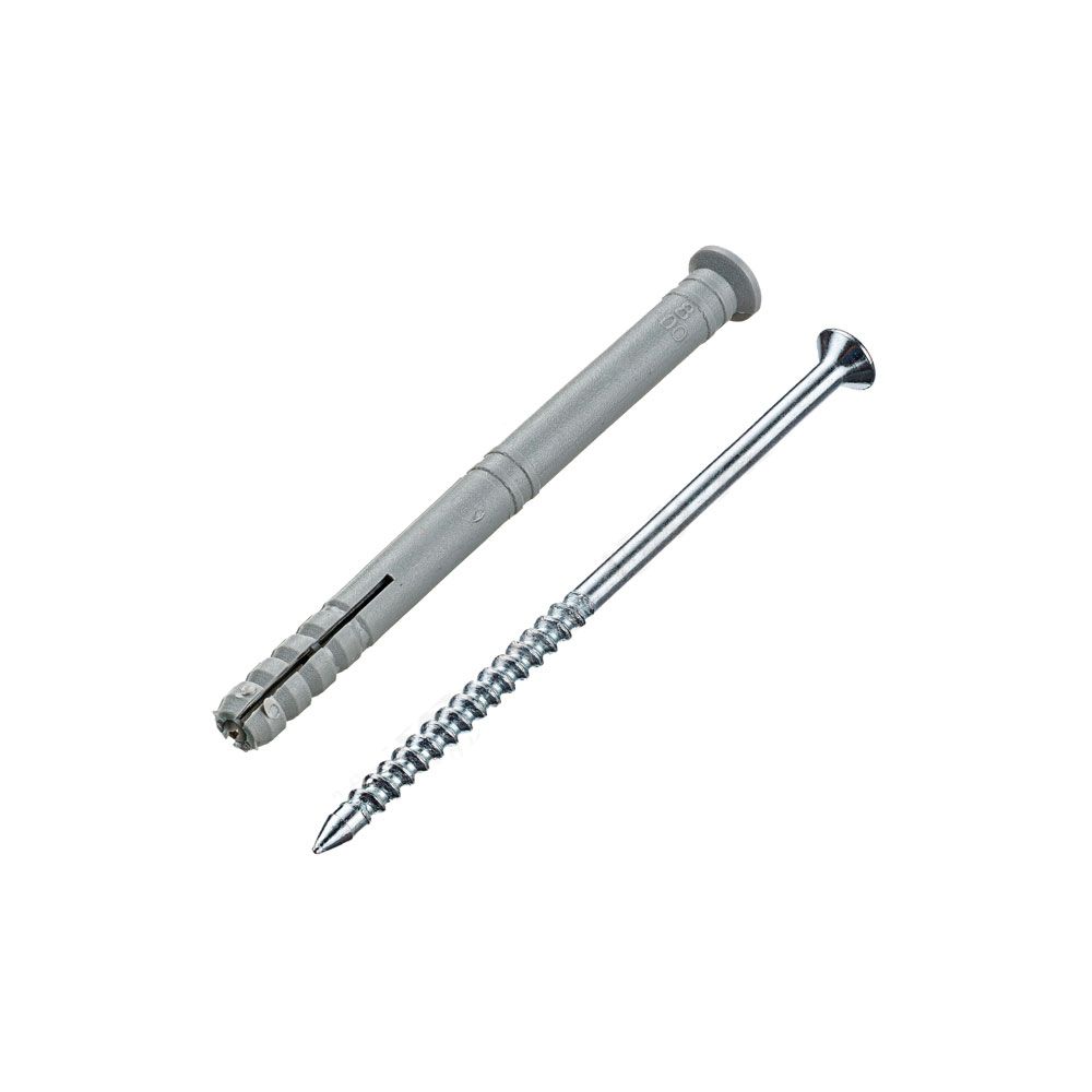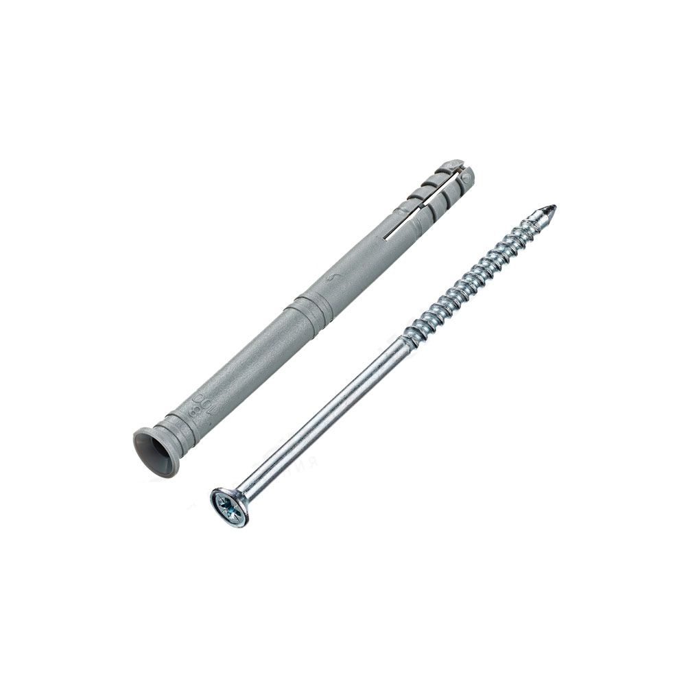 Полипропиленовый распорный дюбель с потайным бортиком для быстрого монтажа в комплекте со стальным оцинкованным гвоздем-шурупом.
