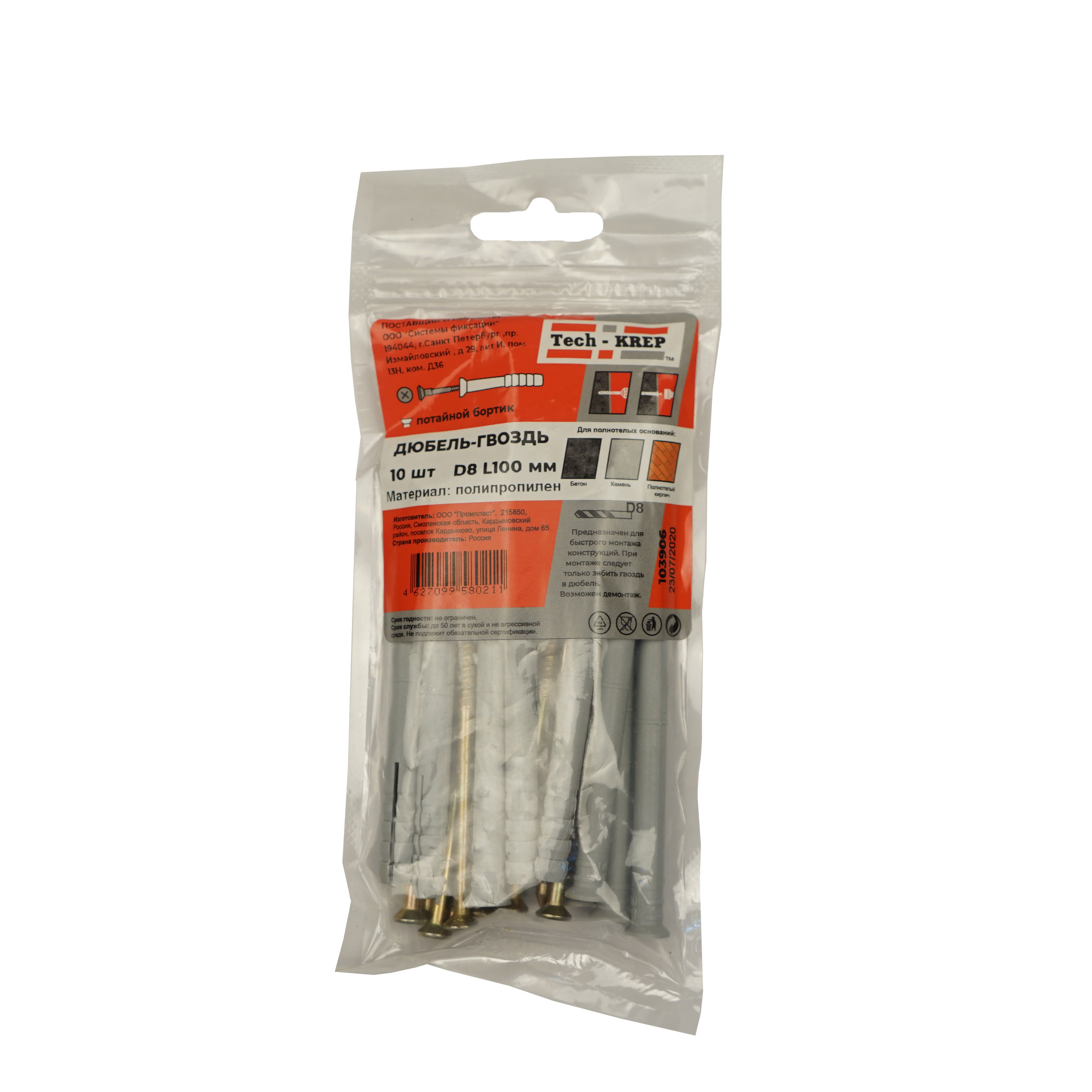 "Дюбель-гвоздь 8х100мм, потайная манжета, полипропилен, черный, пакет 10шт /10 (арт.103906).