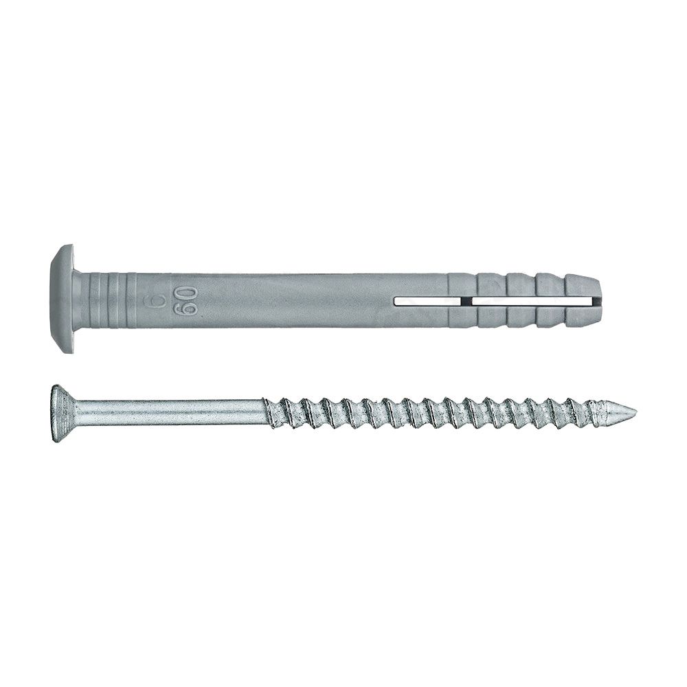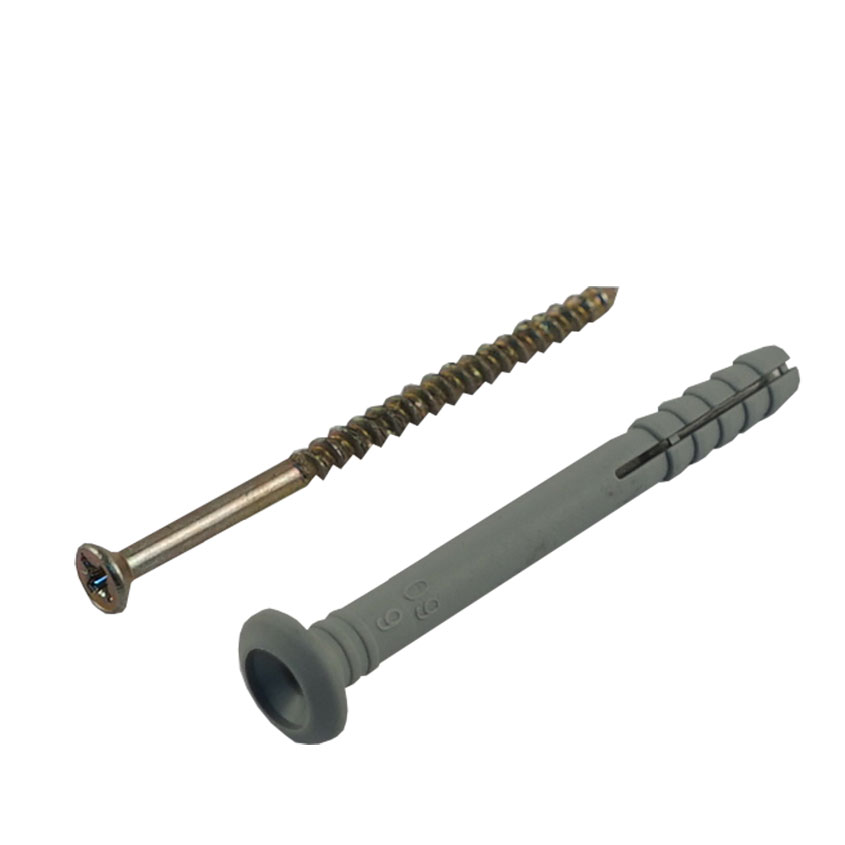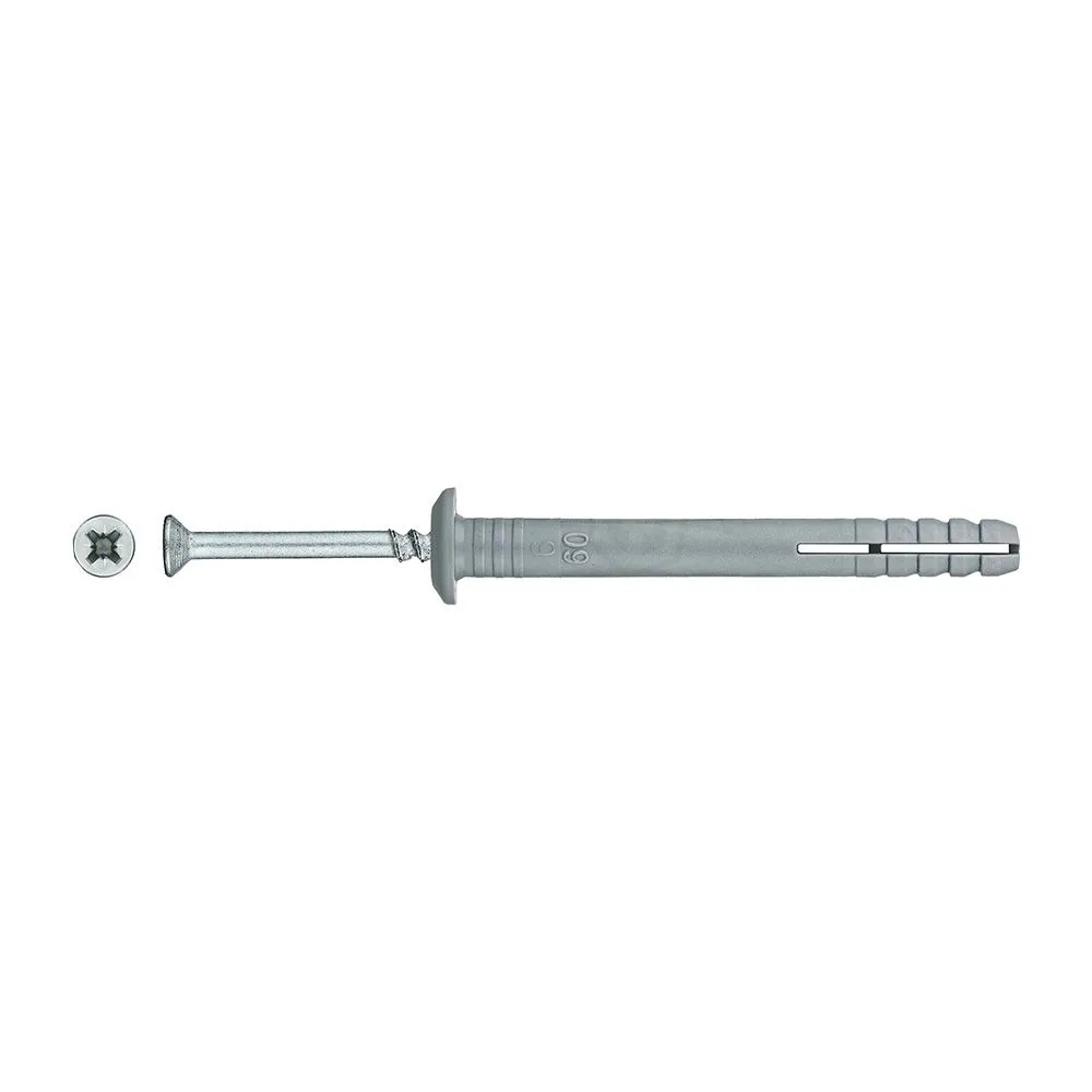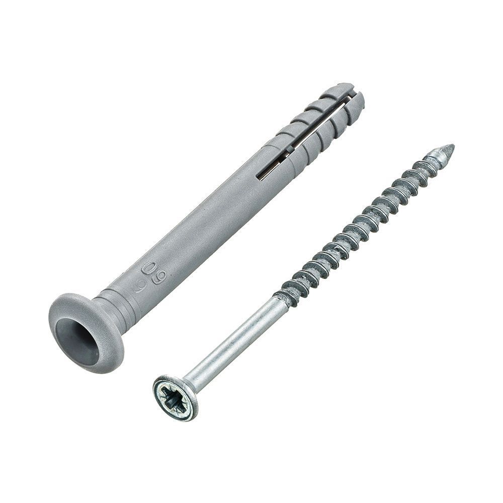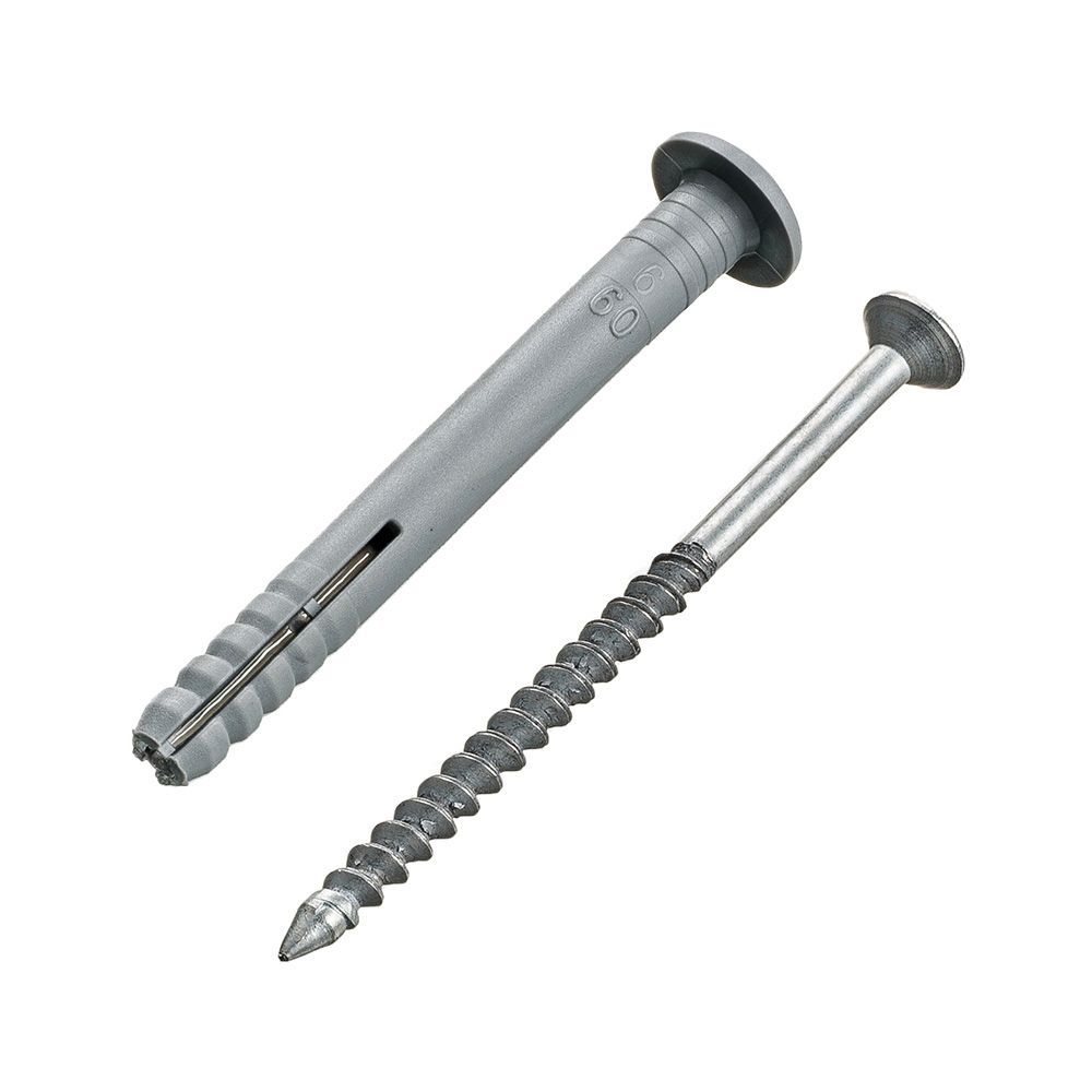 Полипропиленовый распорный дюбель с грибовидной манжетой для быстрого монтажа в комплекте со стальным оцинкованным гвоздем-шурупом.