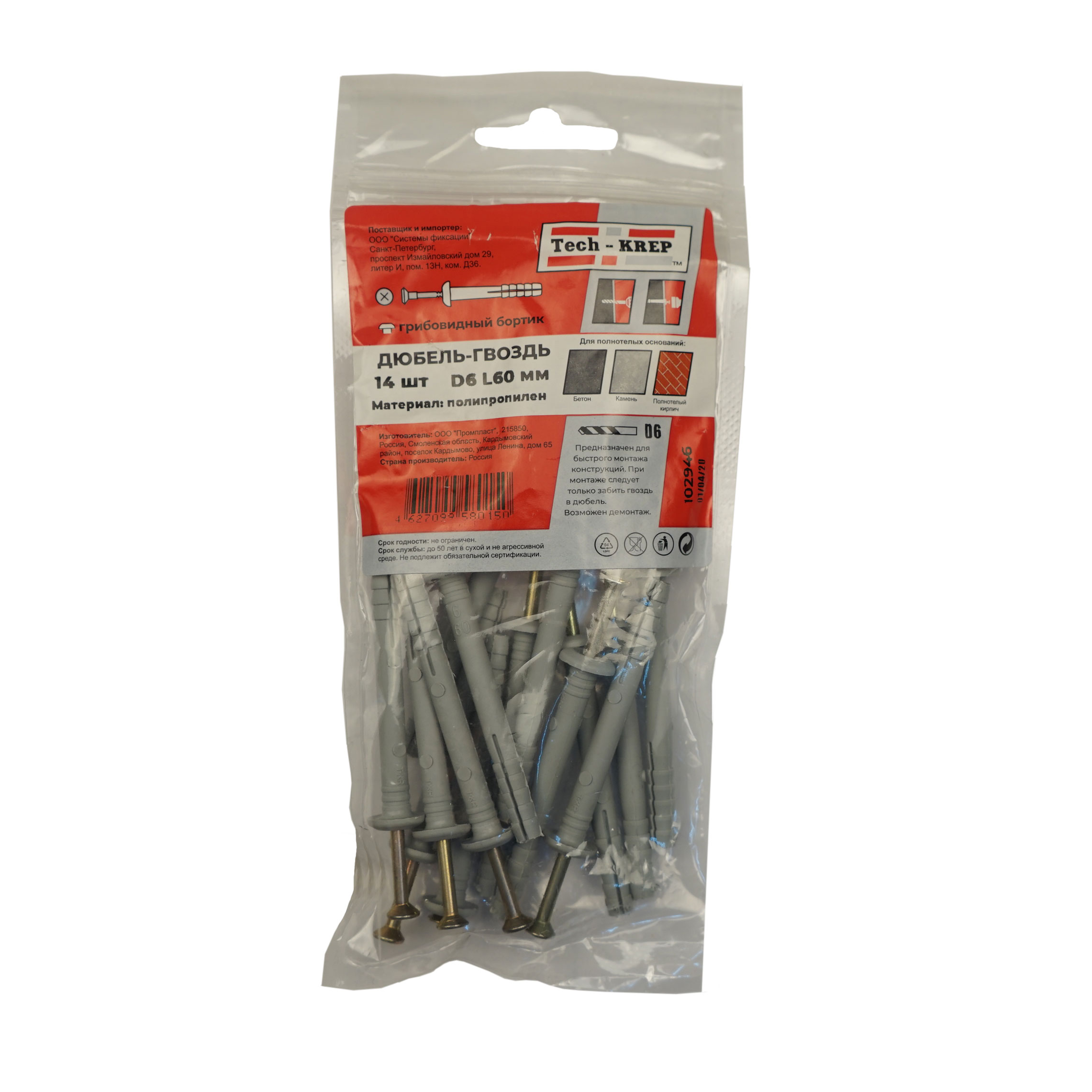 Дюбель-гвоздь 6х60мм, грибовидная манжета, полипропилен.