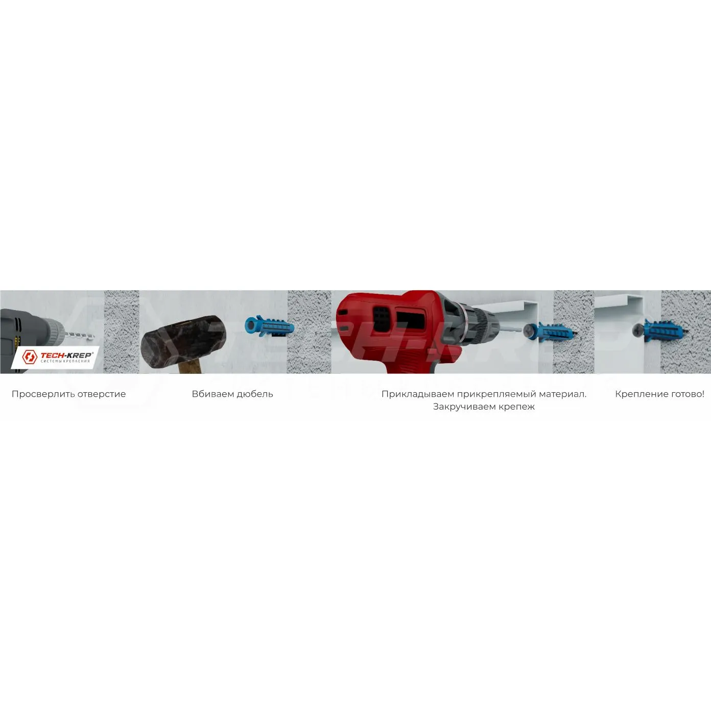 Полипропиленовый универсальный четырехраспорный дюбель с манжетой, шипами и усами применяется для фиксации шурупа при монтаже в плотных материалах. Конструкция предотвращает проворачивание дюбеля в отверстии и обеспечивается прочная фиксация дюбеля в полнотелых строительных материалах.