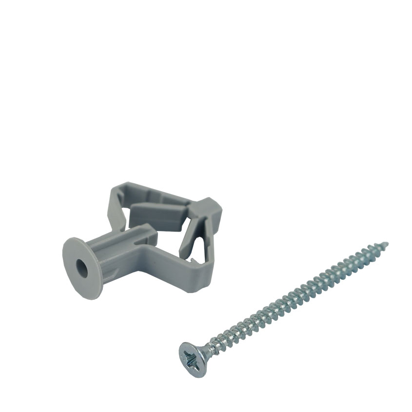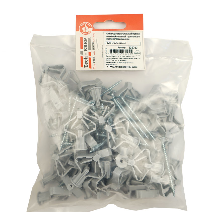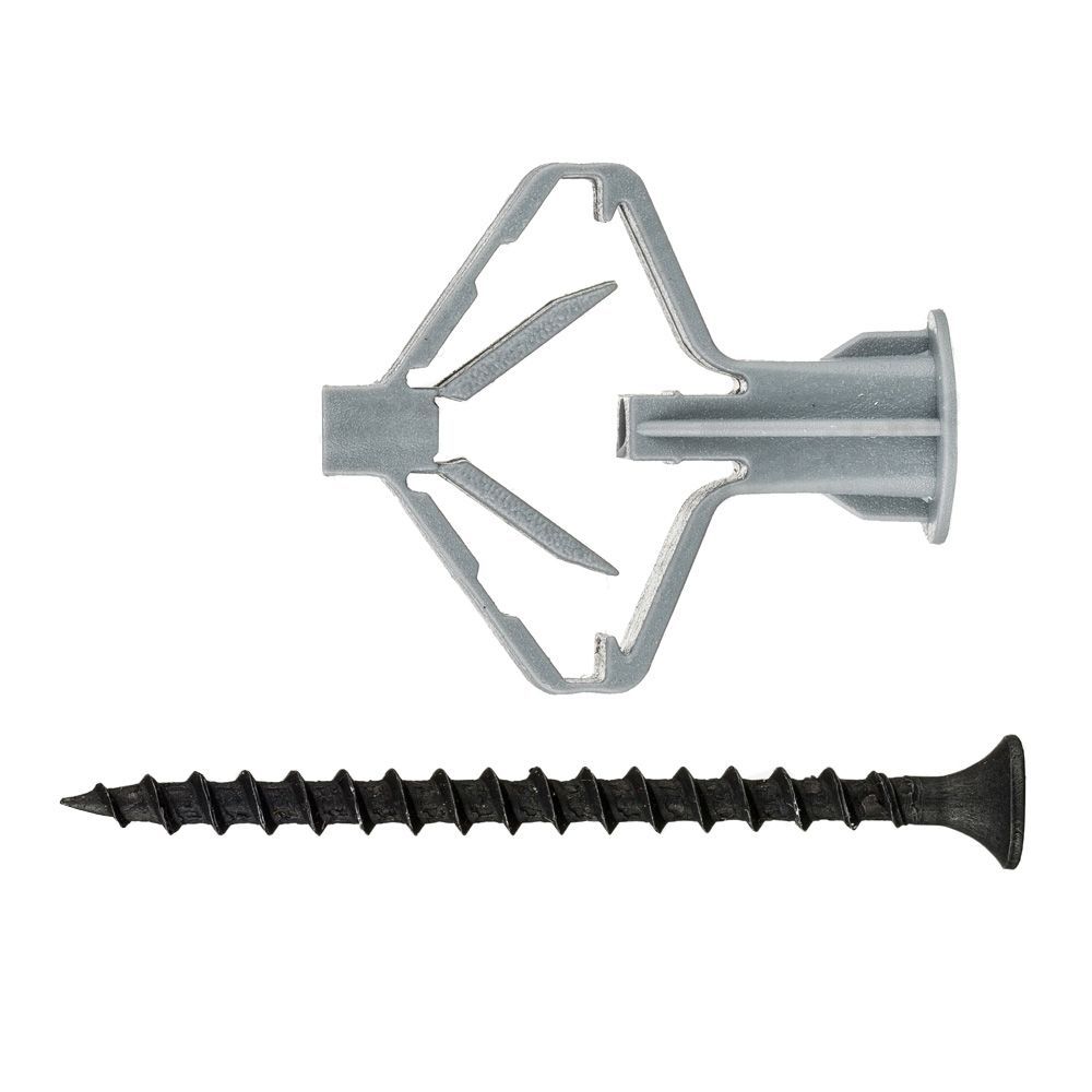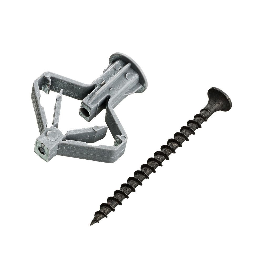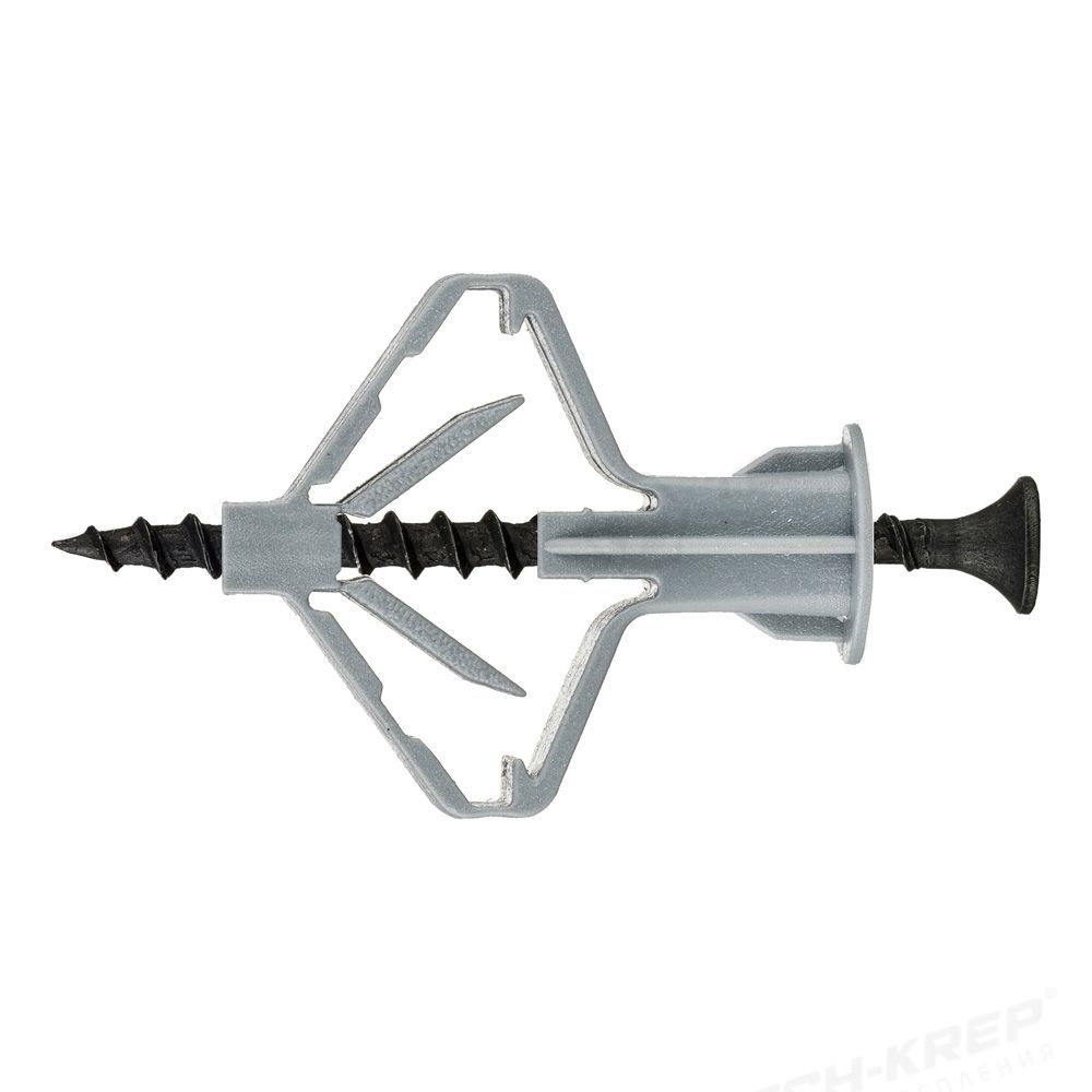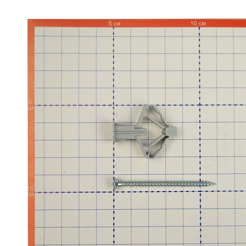 Полипропиленновый распорный дюбель с саморезом для креплений в гипсокартонных стенах. Принцип действия дюбеля-бабочки заключается в том, что при закручивании в него шурупа, пластиковый дюбель сжимается. При этом увеличивается площадь распределения давления закрепляемого предмета. Таким образом, удается уберечь гипсокартонною стену от повреждений.