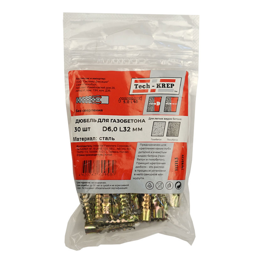 Дюбель для газобетона 6х32 мм является вспомогательным элементом крепежа и используется совместно с различным болтами и шурупами при работе с пористыми материалами.