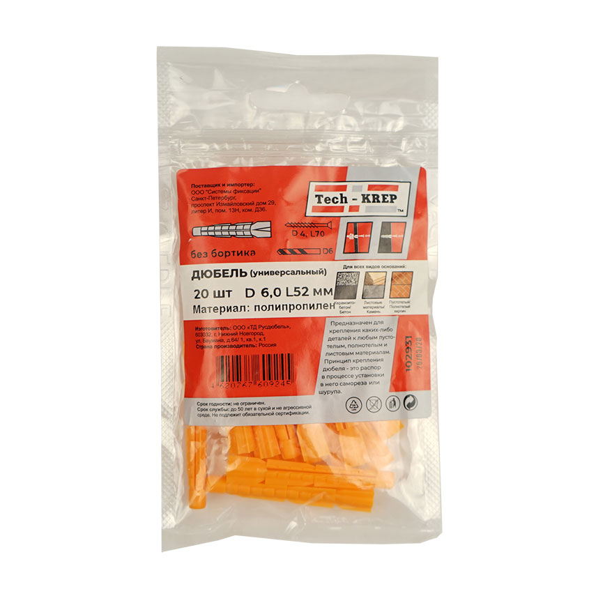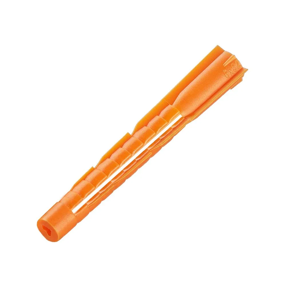 Универсальный дюбель предназначен для стандартных креплений с помощью шурупов в сплошных и пустотелых кладках. Крепёж обеспечивает надёжное крепление детали как в кирпиче, бетоне, так и в гипсокартоне. Три распорных сегмента, соединённых между собой на конце дюбеля, способствуют равномерному распределению сил внутри отверстия, не дают шурупу соскальзывать в сторону, что позволяет дюбелю изменять форму в зависимости от кладки.