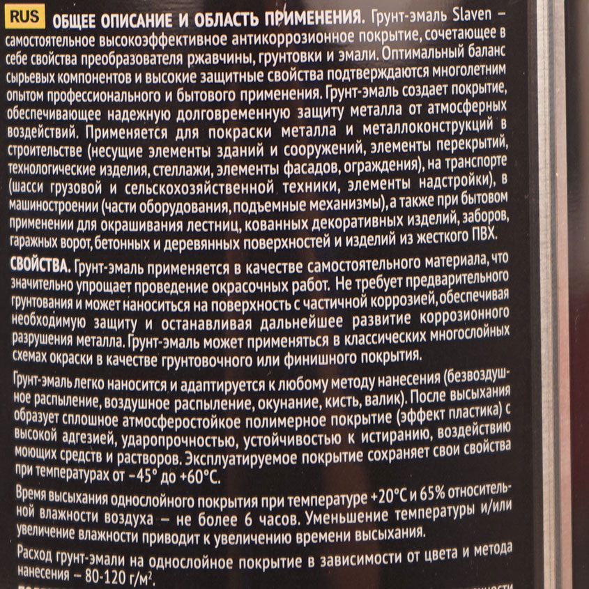 Грунт-эмаль Slaven - это самостоятельное однокомпонентное покрытие, сочетающее в себе свойства преобразователя ржавчины, грунта и эмали. Благодаря специально разработанной формуле связующего и высокотехнологичным добавкам, грунт-эмаль отличается высокими защитными и декоративными свойствами, не расслаивается, не образует осадка и пленок на поверхности. Грунт-эмаль создает долговременную защиту металлических поверхностей, подвергающихся атмосферным воздействиям.