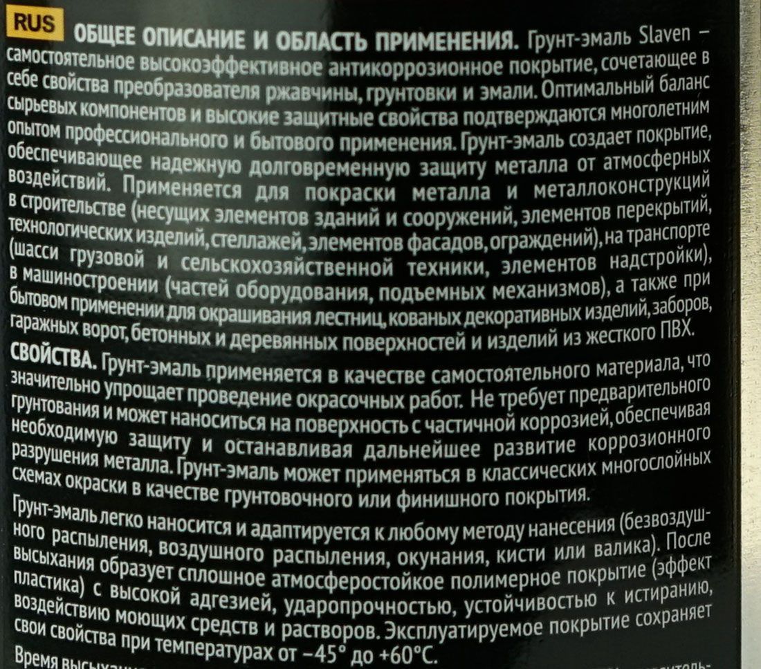 Грунт-эмаль Slaven - это самостоятельное однокомпонентное покрытие, сочетающее в себе свойства преобразователя ржавчины, грунта и эмали. Благодаря специально разработанной формуле связующего и высокотехнологичным добавкам, грунт-эмаль отличается высокими защитными и декоративными свойствами, не расслаивается, не образует осадка и пленок на поверхности. Грунт-эмаль создает долговременную защиту металлических поверхностей, подвергающихся атмосферным воздействиям.