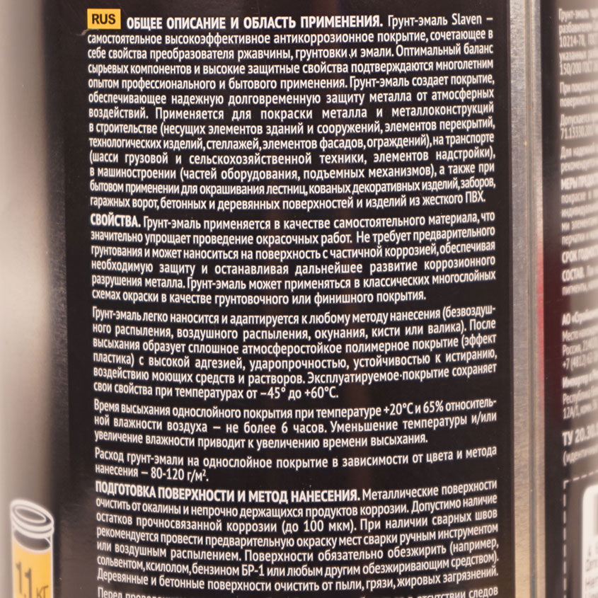 Грунт-эмаль Slaven - это самостоятельное однокомпонентное покрытие, сочетающее в себе свойства преобразователя ржавчины, грунта и эмали. Благодаря специально разработанной формуле связующего и высокотехнологичным добавкам, грунт-эмаль отличается высокими защитными и декоративными свойствами, не расслаивается, не образует осадка и пленок на поверхности. Грунт-эмаль создает долговременную защиту металлических поверхностей, подвергающихся атмосферным воздействиям.