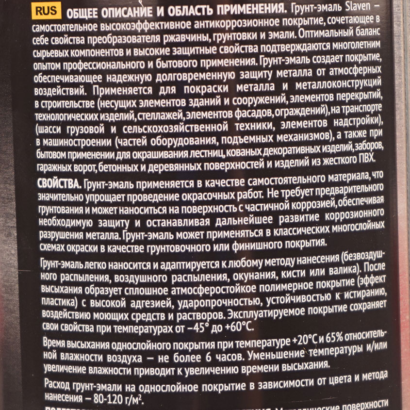 Грунт-эмаль Slaven - это самостоятельное однокомпонентное покрытие, сочетающее в себе свойства преобразователя ржавчины, грунта и эмали. Благодаря специально разработанной формуле связующего и высокотехнологичным добавкам, грунт-эмаль отличается высокими защитными и декоративными свойствами, не расслаивается, не образует осадка и пленок на поверхности. Грунт-эмаль создает долговременную защиту металлических поверхностей, подвергающихся атмосферным воздействиям.