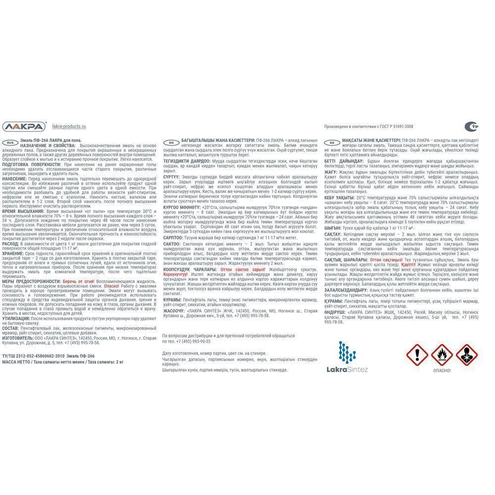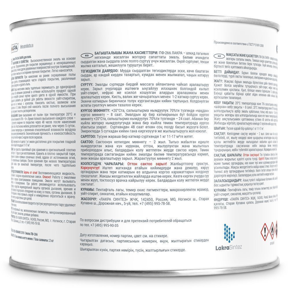 Эмаль Лакра для пола - высококачественная эмаль на основе алкидного лака. Эмаль для пола Лакра образует полуглянцевую поверхность, стойкую к механическим воздействиям, влаге и истиранию. Она отличается высокими декоративными и защитными свойствами, стойкая к мытью. Эмаль готова к применению. Быстро высыхает.