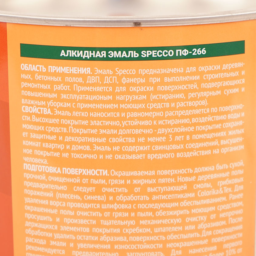 Эмаль алкидная для пола «Specco» применяется для покрытия окрашенных и неокрашенных деревянных, бетонных полов и ДСП. Обладает повышенной стойкостью к истиранию и воздействию моющих средств.