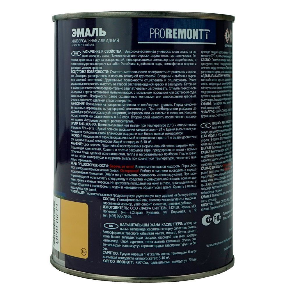 Эмаль ПФ-115 Proremontt бежевая 0,9кг цена - купить в Барнауле, Бийске. Размеры, характеристики, фото в интернет-магазине.