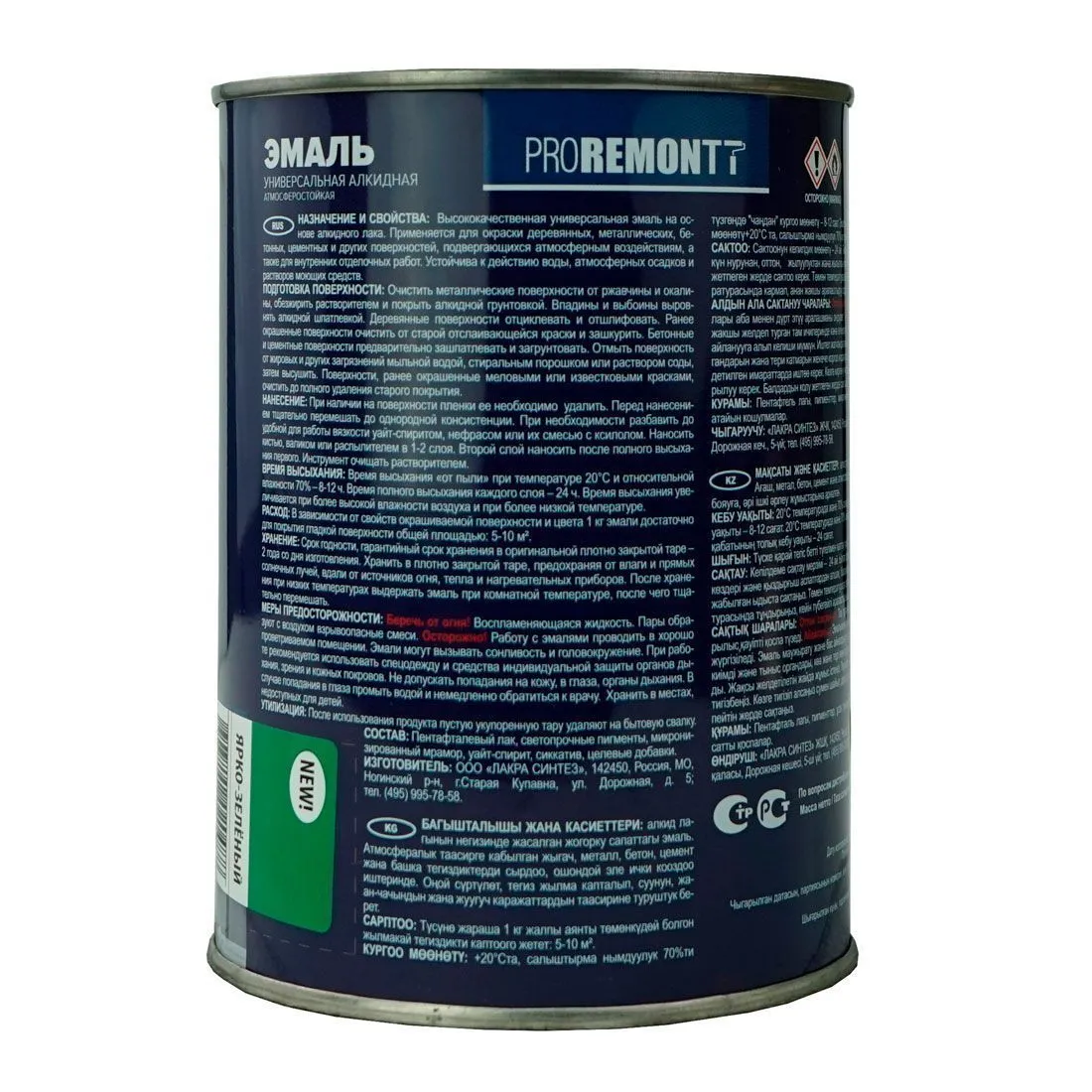 Эмаль ПФ-115 Proremontt ярко-зеленая 0,9кг цена - купить в Барнауле, Бийске. Размеры, характеристики, фото в интернет-магазине.