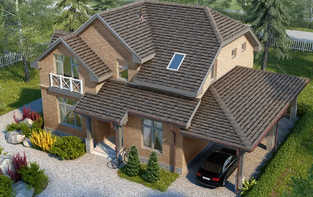 При помощи фасадной плитки Хауберк выполняют облицовку фасадов строений из дерева, пено- и газоблоков, а также заборов и ограждений. Фасадную плитку HAUBERK применяют и для декоративного оформления входных групп и фронтонов.