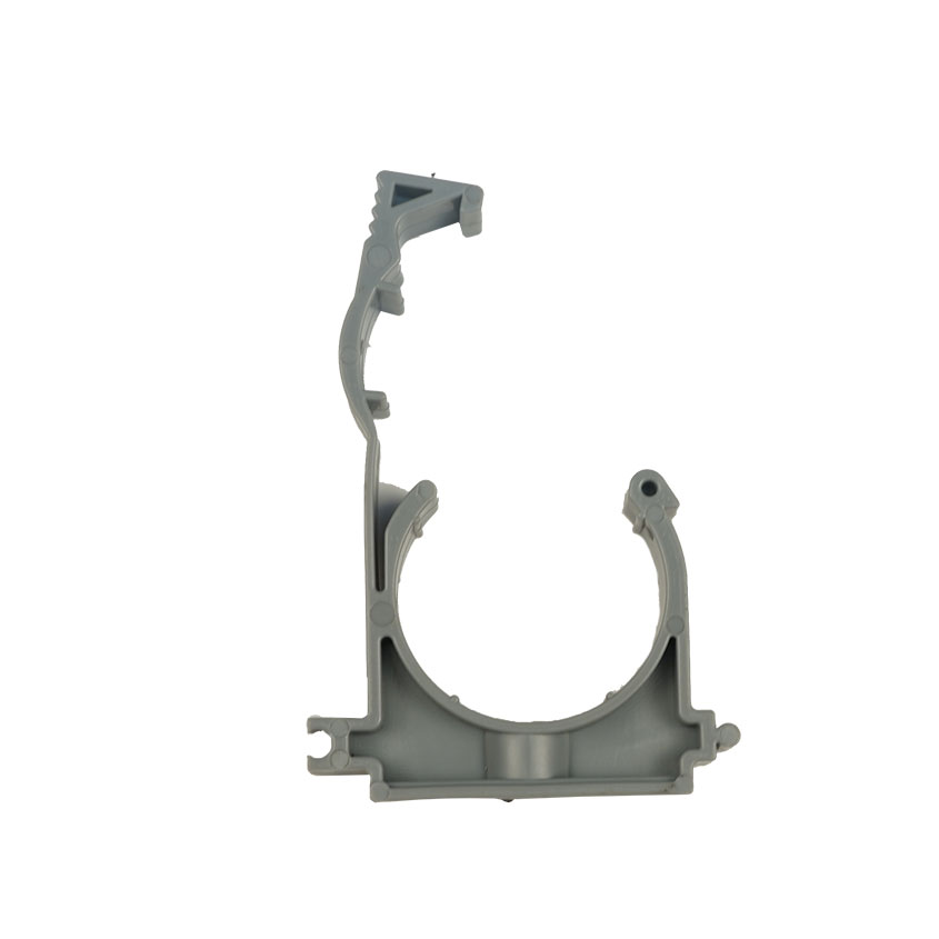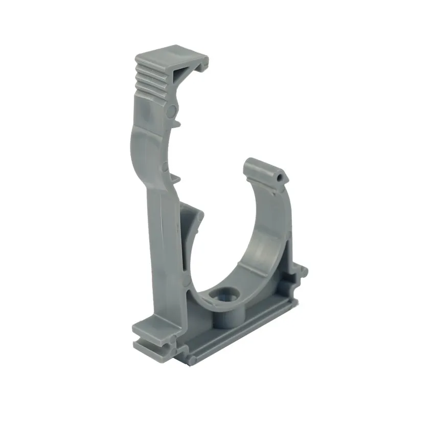 Одна сторона хомута крепится к стене (при помощи дюбеля и самореза), а другая сторона при помощи специальной защелки фиксируется на трубопроводе.