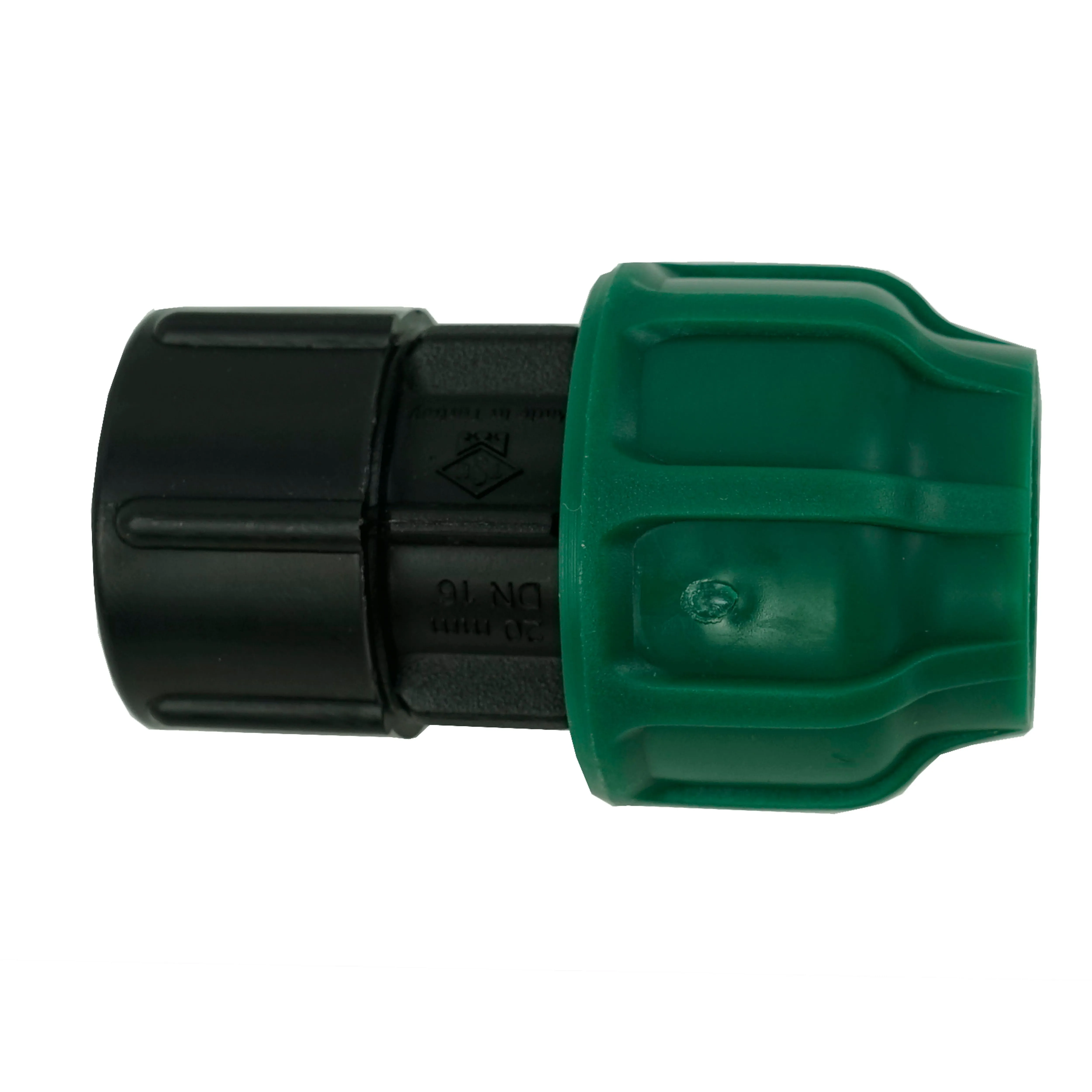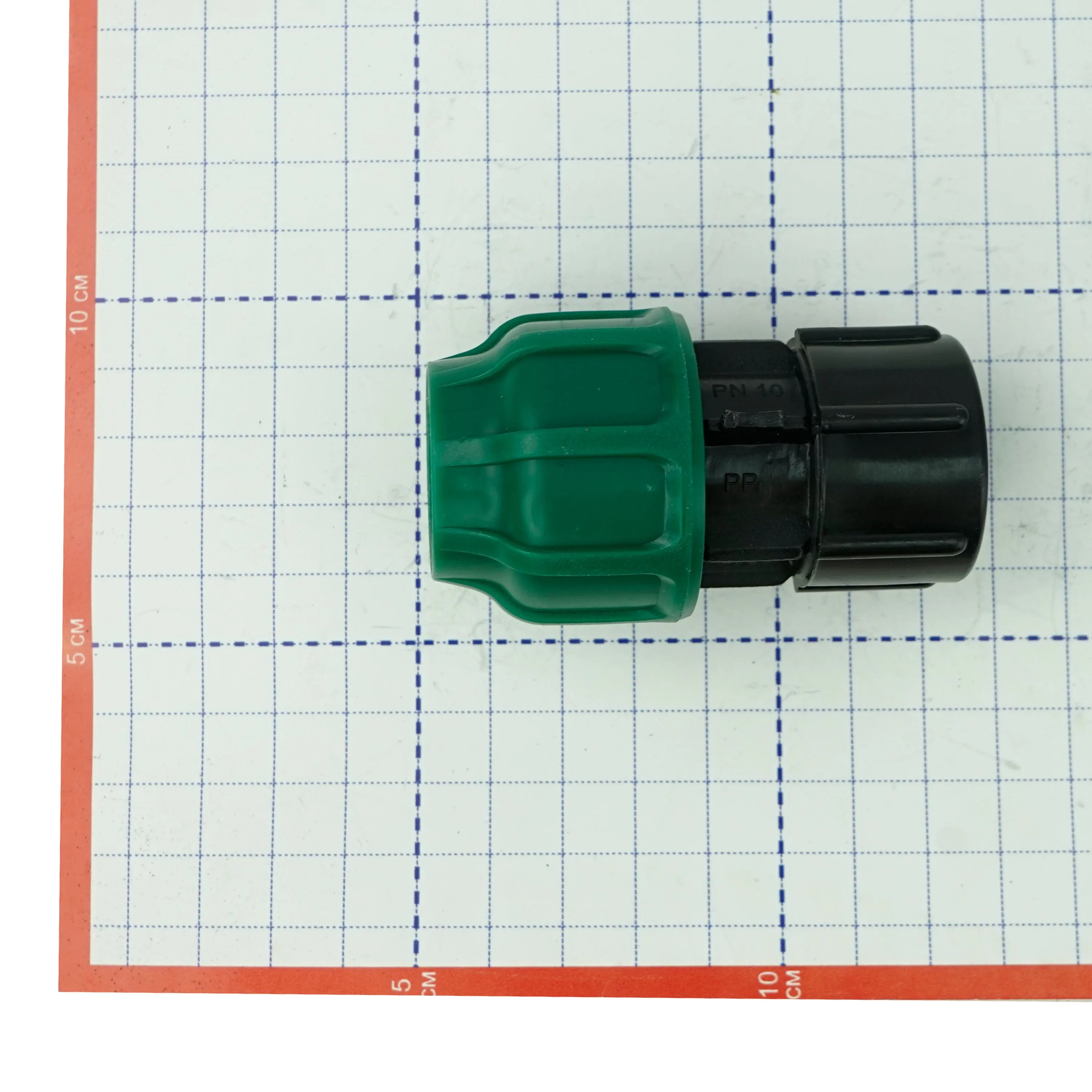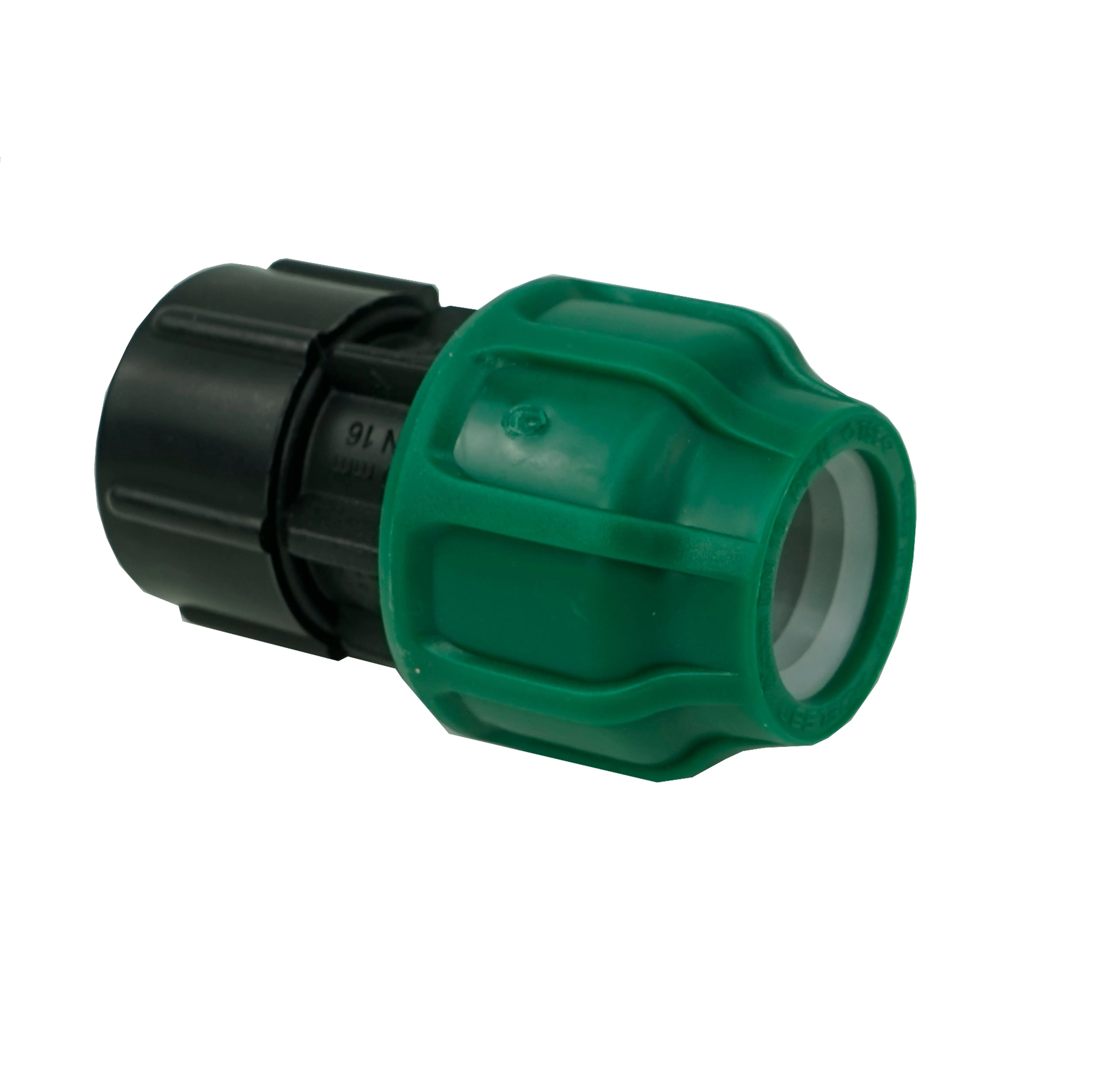 Муфта компрессионная с внутренней резьбой имеет шаг резьбы, соответствующий стандартному шагу стальной резьбы, что позволяет ее использовать для перехода с полиэтиленовой трубы на стальную или металлическую запорную арматуру. Используется компрессионная муфта в внутренней резьбой с трубами для питьевого или технического водоснабжения с рабочим давлением до 16 атмосфер. Обладает высокими эксплуатационными качествами, имеет невысокую стоимость.