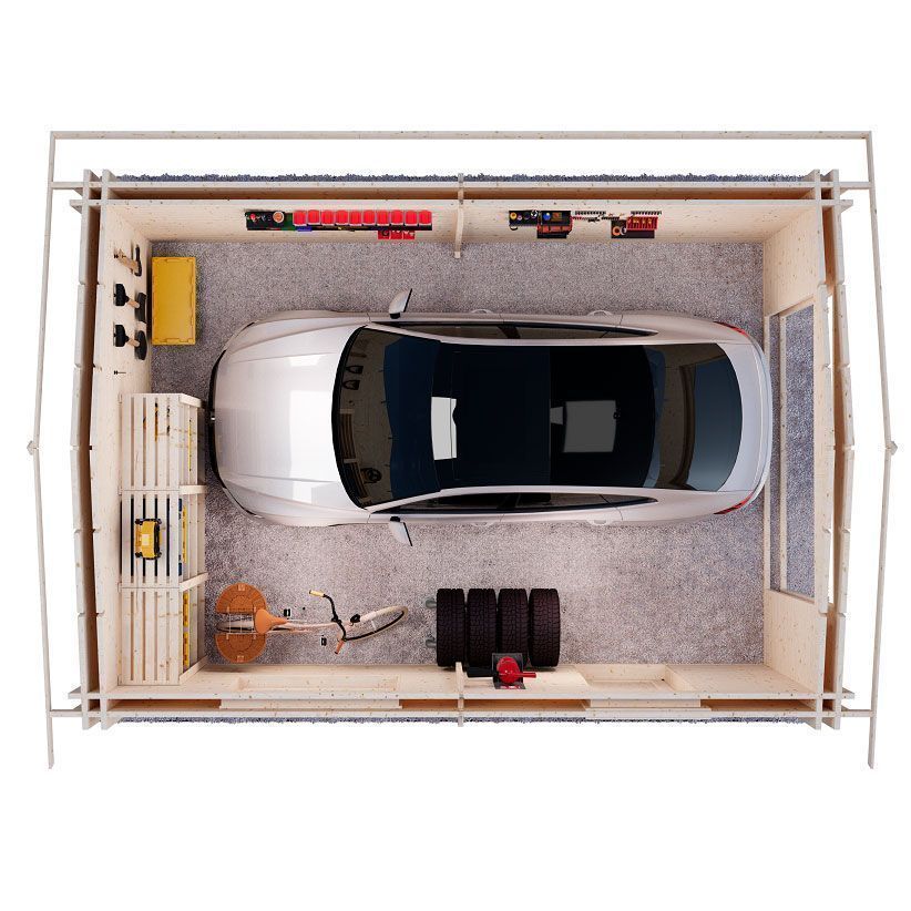 Компактный гараж 4х6 м, общей площадью 20,2 м² рассчитан на один автомобиль. Стены выполнены из двойного бруса, что позволяет произвести внутристенное утепление при необходимости. Для удобства использования в гараже предусмотрено одно распашное окно и отдельный вход с дверью.