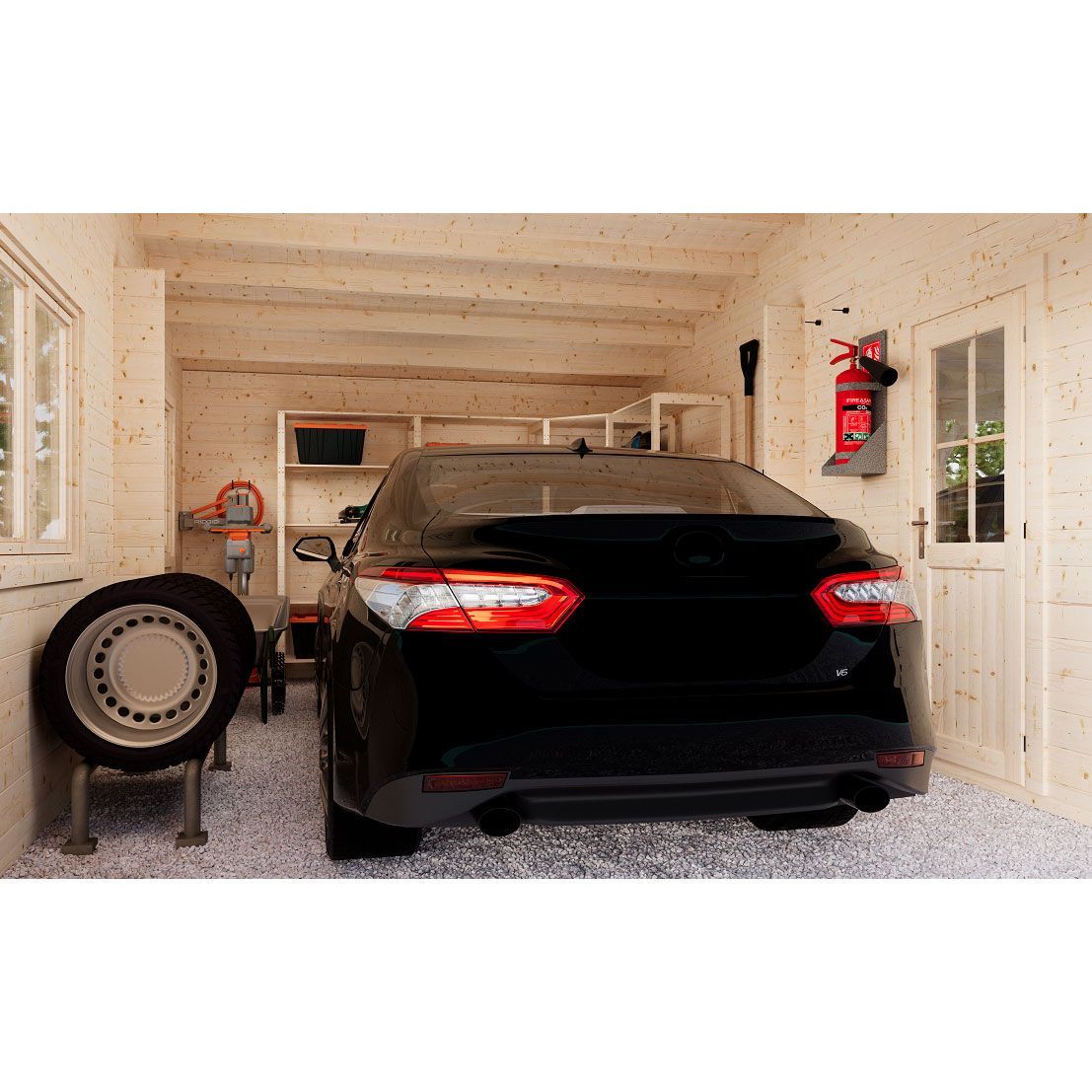 Вместительный гараж 6×9,5 м площадью 52 м² объединяет в себе две площадки под одной скатной кровлей, скрытой за парапетом. Закрытая часть рассчитана на один автомобиль и оснащена двумя распашными окнами для естественного освещения и отдельным входом со стороны навеса. Открытая часть под навесом вмещает два автомобиля. Это решение для тех, кто ищет гибкое и функциональное пространство для парковки автомобилей и организации пространства.