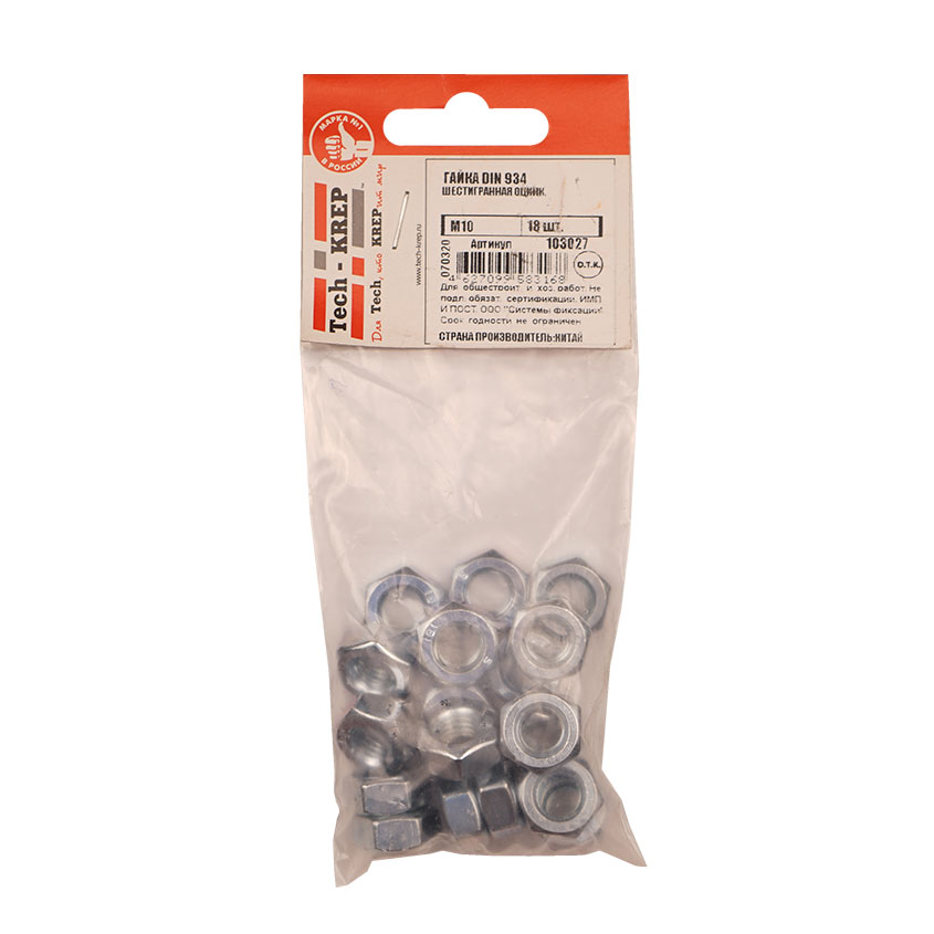 Гайка DIN934 оцинкованная М10 шестигранная гайка с внутренней резьбой для создания резьбового соединения с различными крепежными элементами.