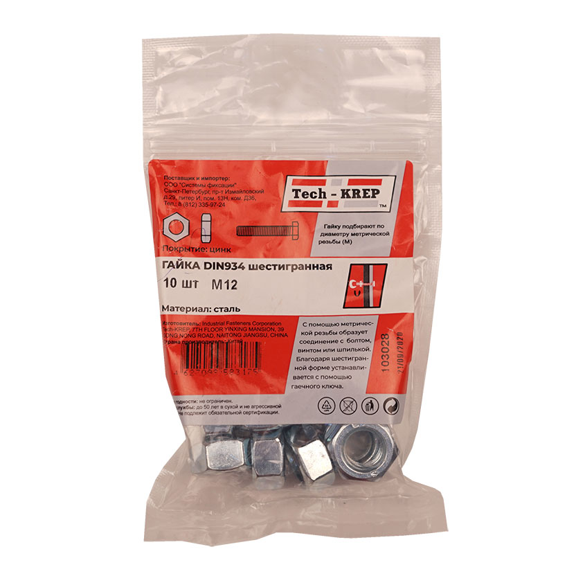 Гайка DIN934 оцинкованная М12 шестигранная гайка с внутренней резьбой для создания резьбового соединения с различными крепежными элементами.