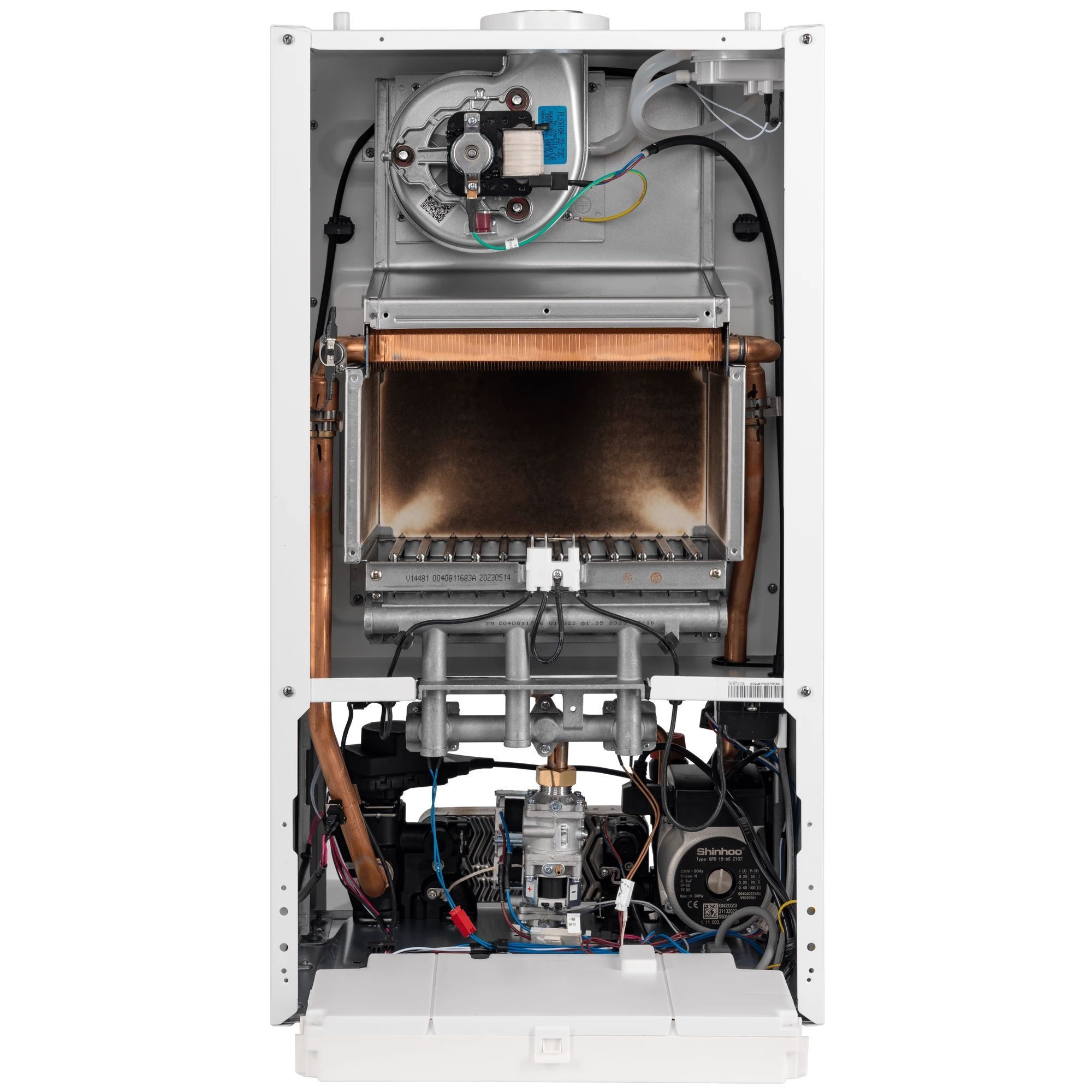 - Котел имеет высокоэффективный первичный теплообменник, изготовленный из бескислородной меди, который отличается высокой надежностью и модернизированной горелкой, работающей в широком диапазоне мощностей.
