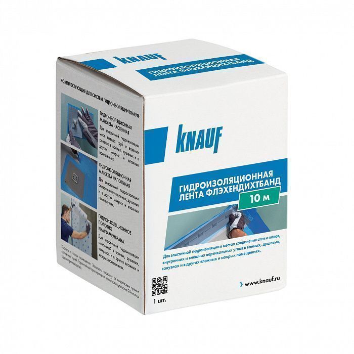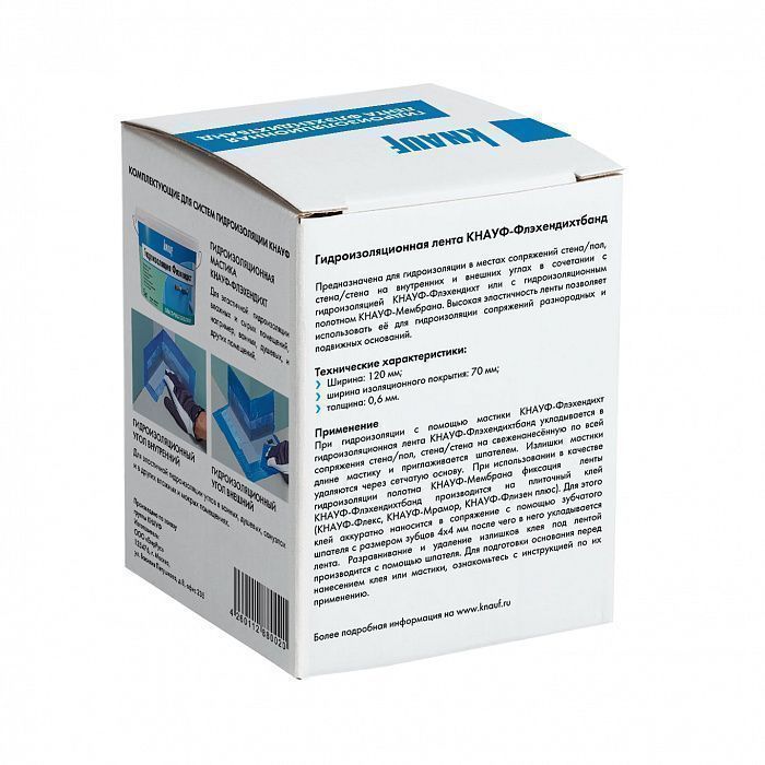 Предназначена для гидроизоляции в местах сопряжений стена/пол, внутренних и внешних углов и т.п. в сочетании с гидроизоляцией КНАУФ-Флэхендихт.