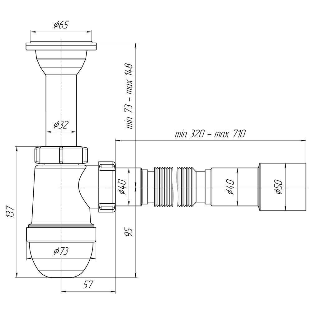 Сифон для кухонной мойки бутылочного типа. Комплектуется гибкой трубой для отвода в канализацию.