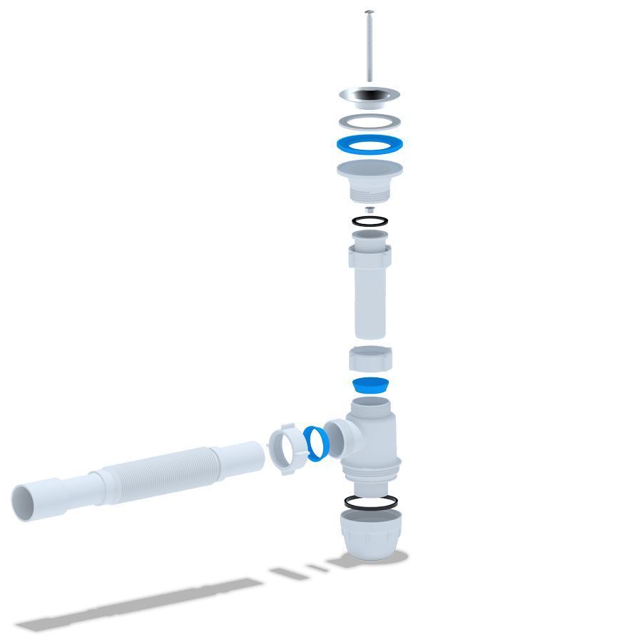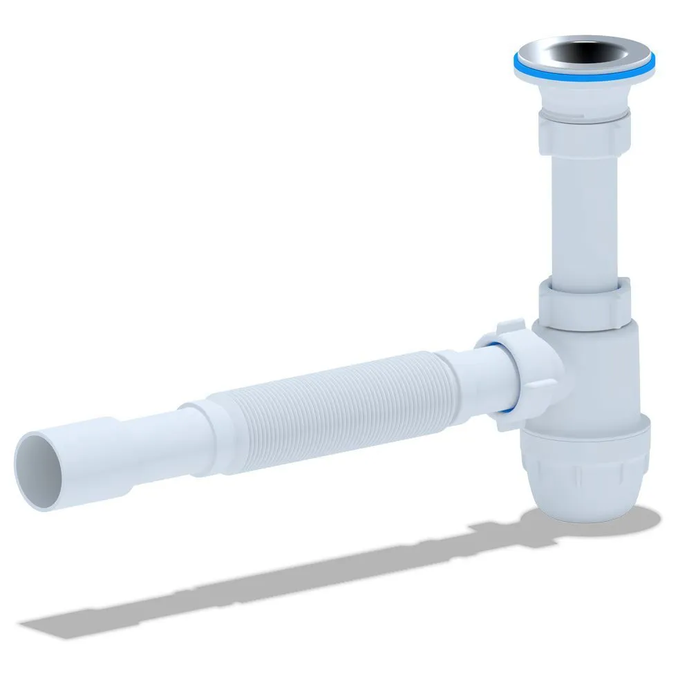 Сифон бутылочного типа для мойки с уменьшенным корпусом и гибкой трубой.