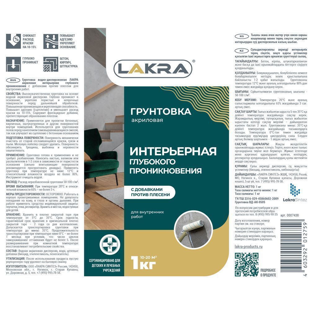 Грунт интерьерный глубокого проникновения пр. плесени Лакра 1л /12 цена - купить в Барнауле, Бийске. Размеры, характеристики, фото в интернет-магазине.