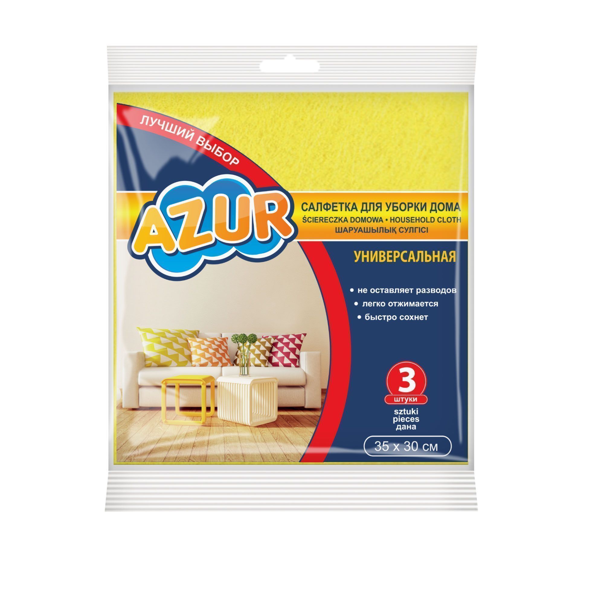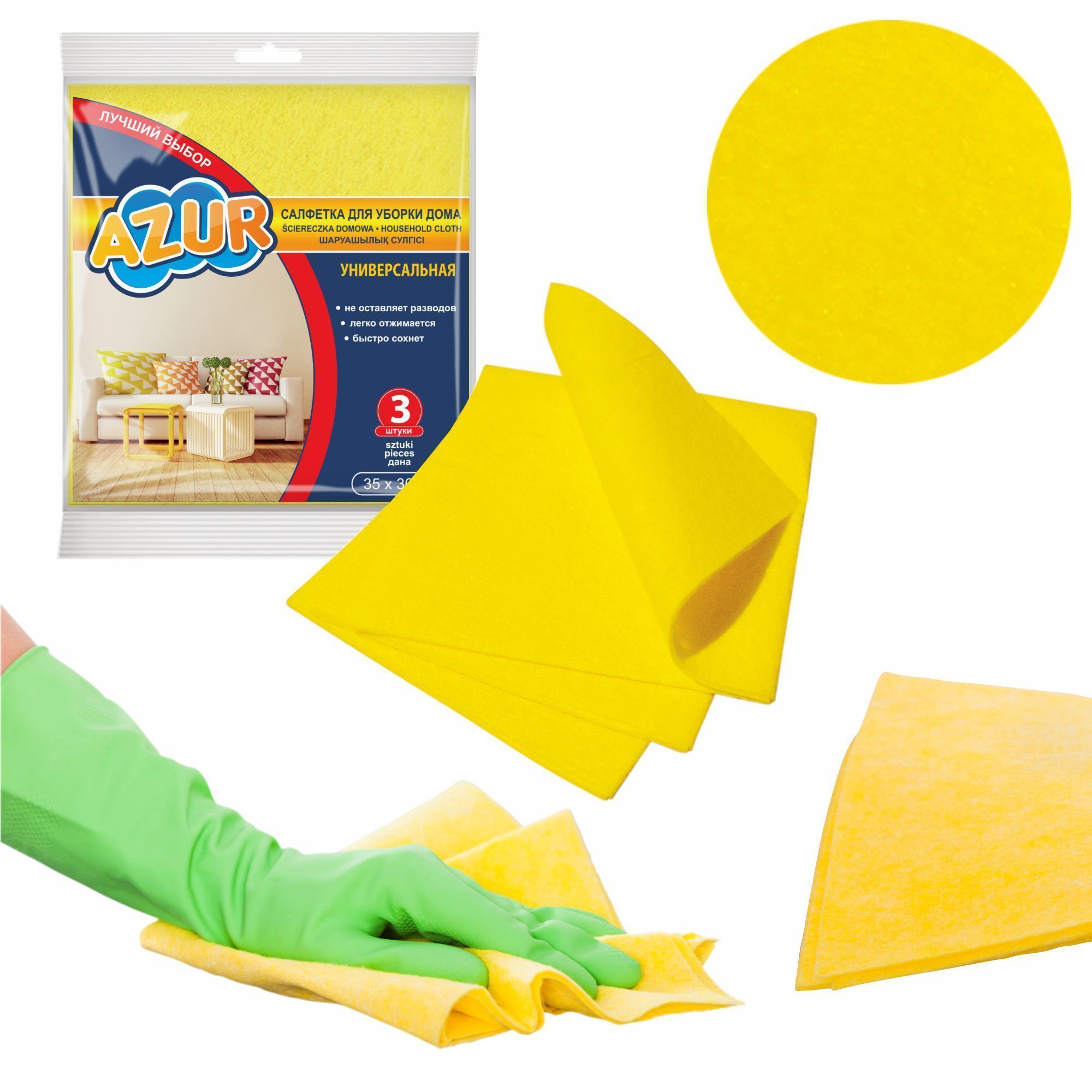 Универсальная салфетка из вискозы AZUR для экономных и рачительных хозяек. Идеально подходит для очистки кухонной столешницы и поверхности садовой мебели. Изготовлена из прочного материала – прослужит долго.