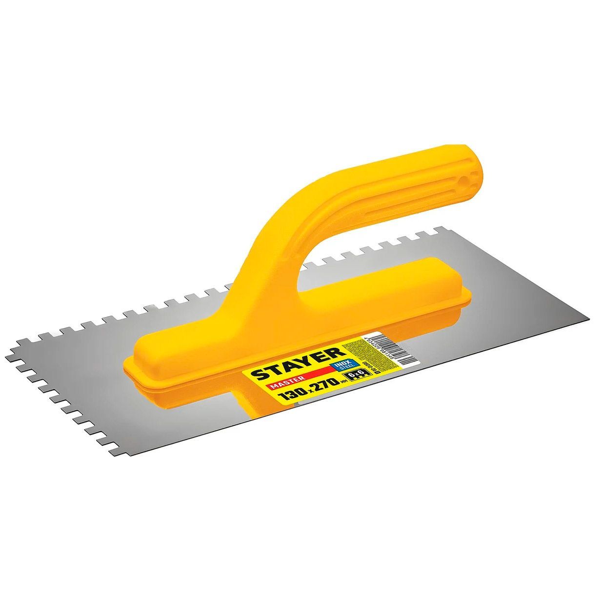 Штукатурная зубчатая нержавеющая гладилка с пластиковой ручкой Stayer Master 130x270 мм, 6x6 мм 08012-06_z01 подойдет для быстрого выравнивания слоя плиточного клея или любого другого состава.