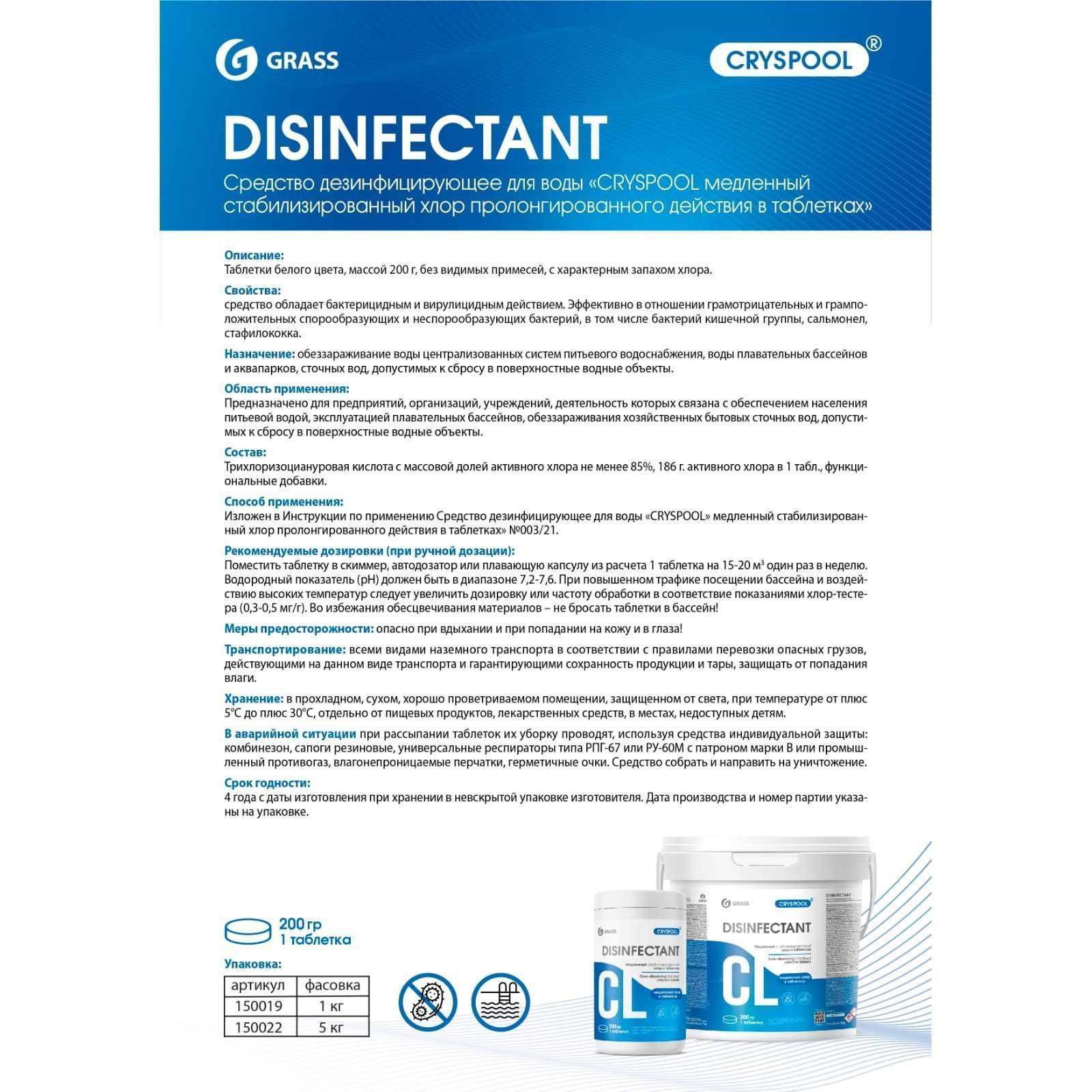 Средство дезинфицирующее для воды CRYSPOOL медленный стабилизированный хлор пролонгированного действия в таблетках.