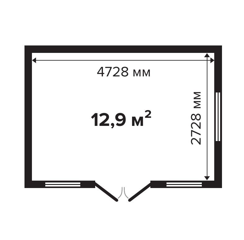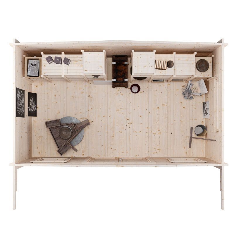 Хозблок 5×3 м начинается со входа — и этот вход впечатляет. Широкий фронтальный свес позволяет создать комфортную тень и защиту от осадков. Благодаря трем окнам в помещении достаточно света. Распашные двери можно будет открыть даже в дождливый день, чтобы с комфортом поработать за верстаком, столом, или организовать хранение на большой площади 12,9 м².