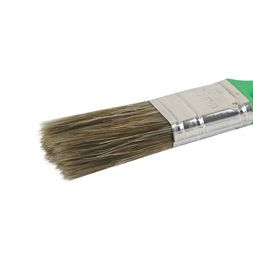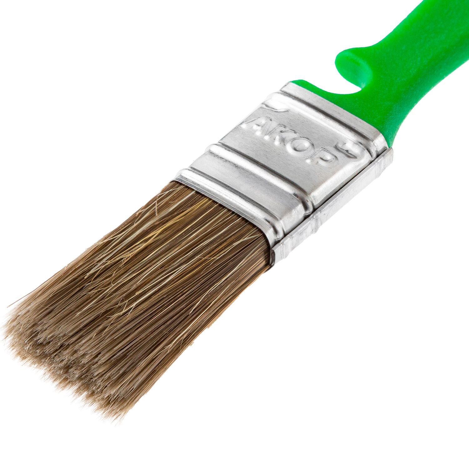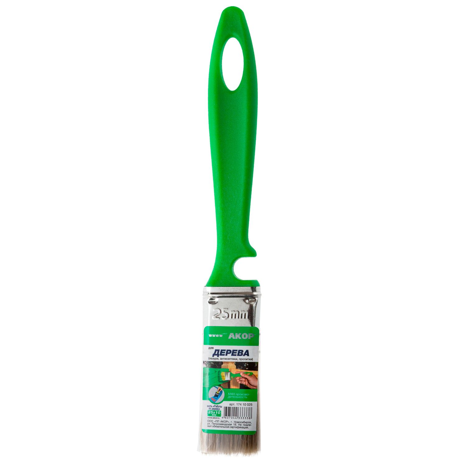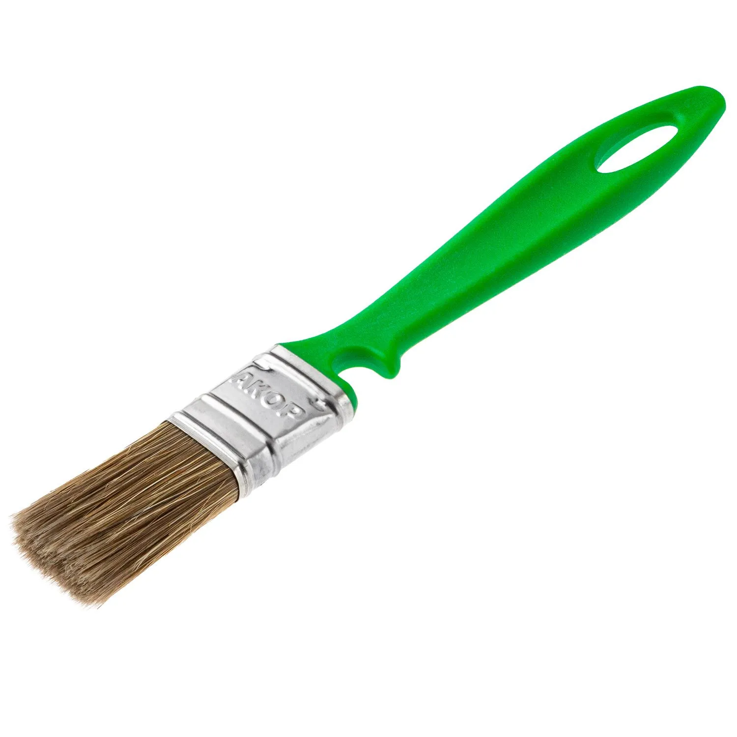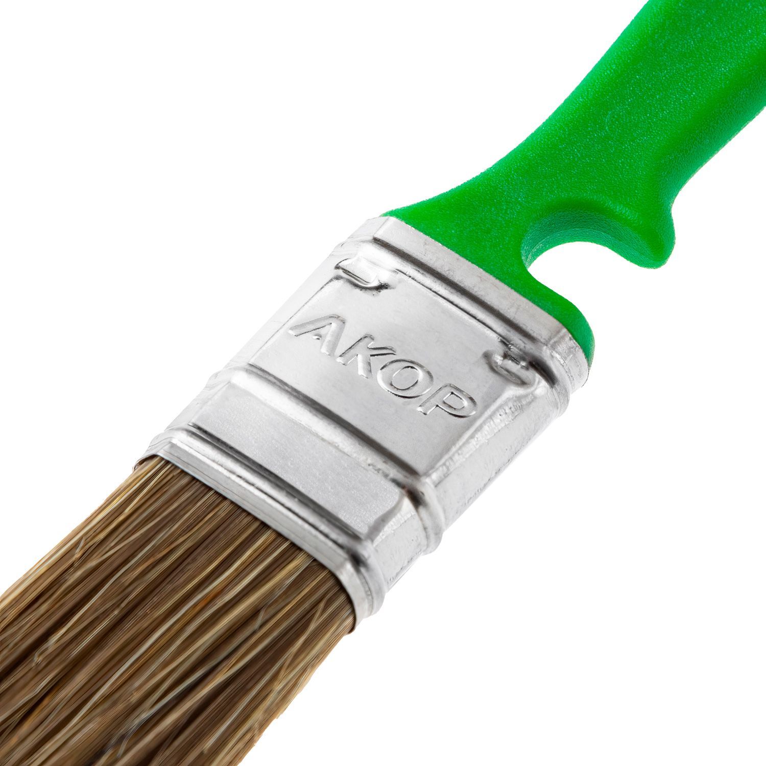Кисть плоская Работы по дереву (АКОР) смешанная щетина, зеленая пластиковая ручка с креплением. Идеальный инструмент для качественного окрашивания. Рукоятка оснащена отверстием для подвешивания и креплением.