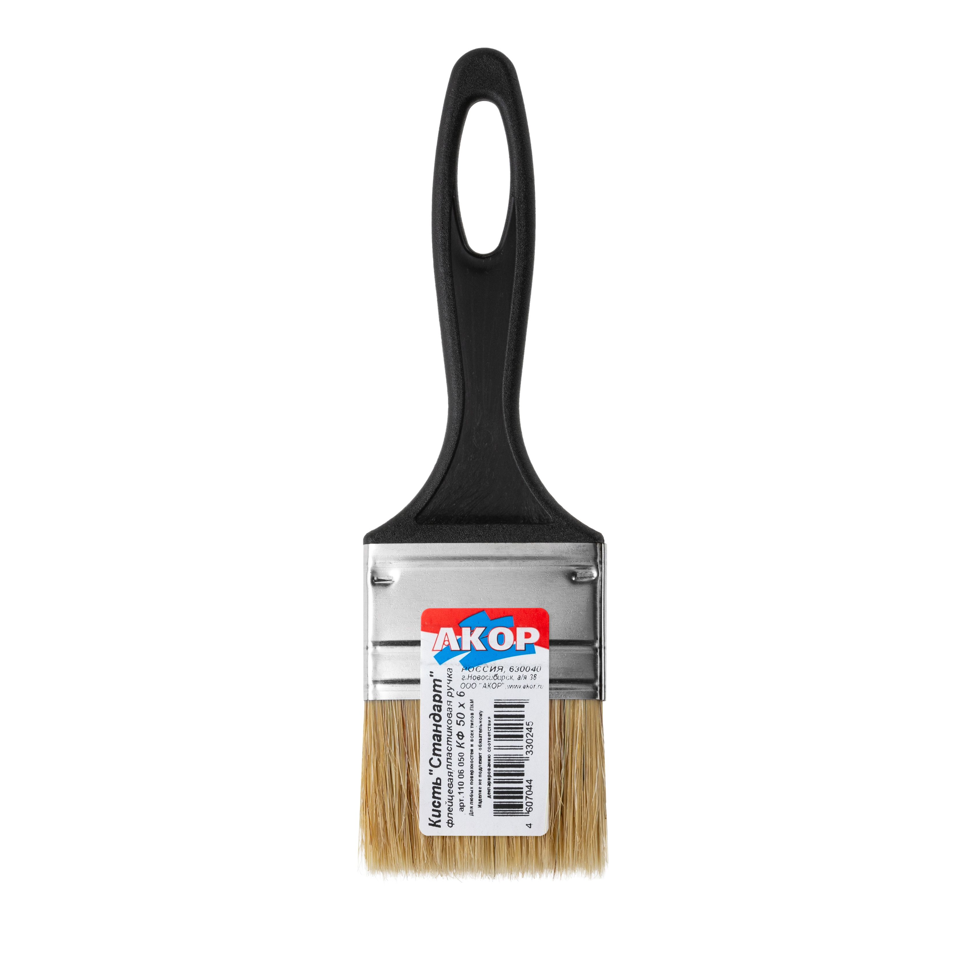 Кисть плоская Стандарт (АКОР) натуральная щетина, черная пластиковая ручка. Идеальный инструмент для качественного окрашивания. Рукоятка оснащена отверстием для подвешивания.