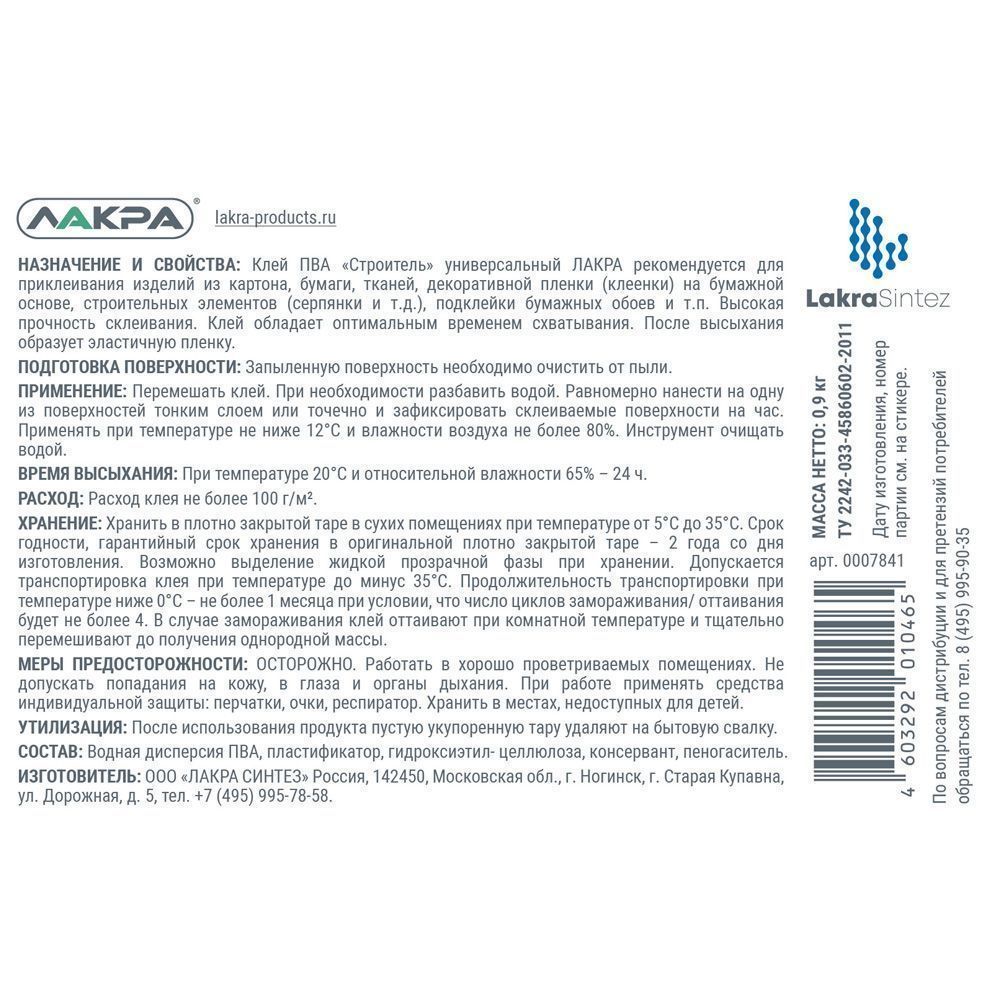 - Возможно разведение клея ПВА Лакра Строитель универсальный водой до рабочей вязкости;