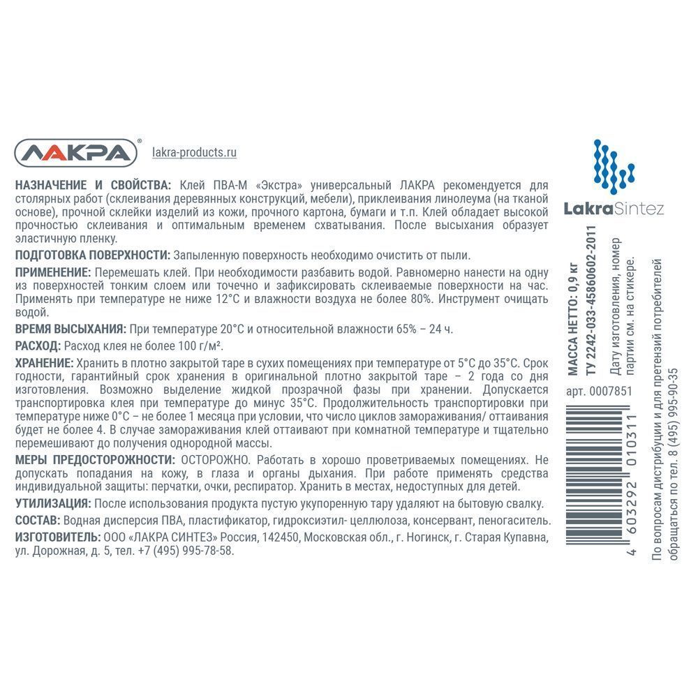 Клей ПВА-М Лакра универсальный Экстра 0,9кг цена - купить в Барнауле, Бийске. Размеры, характеристики, фото в интернет-магазине.