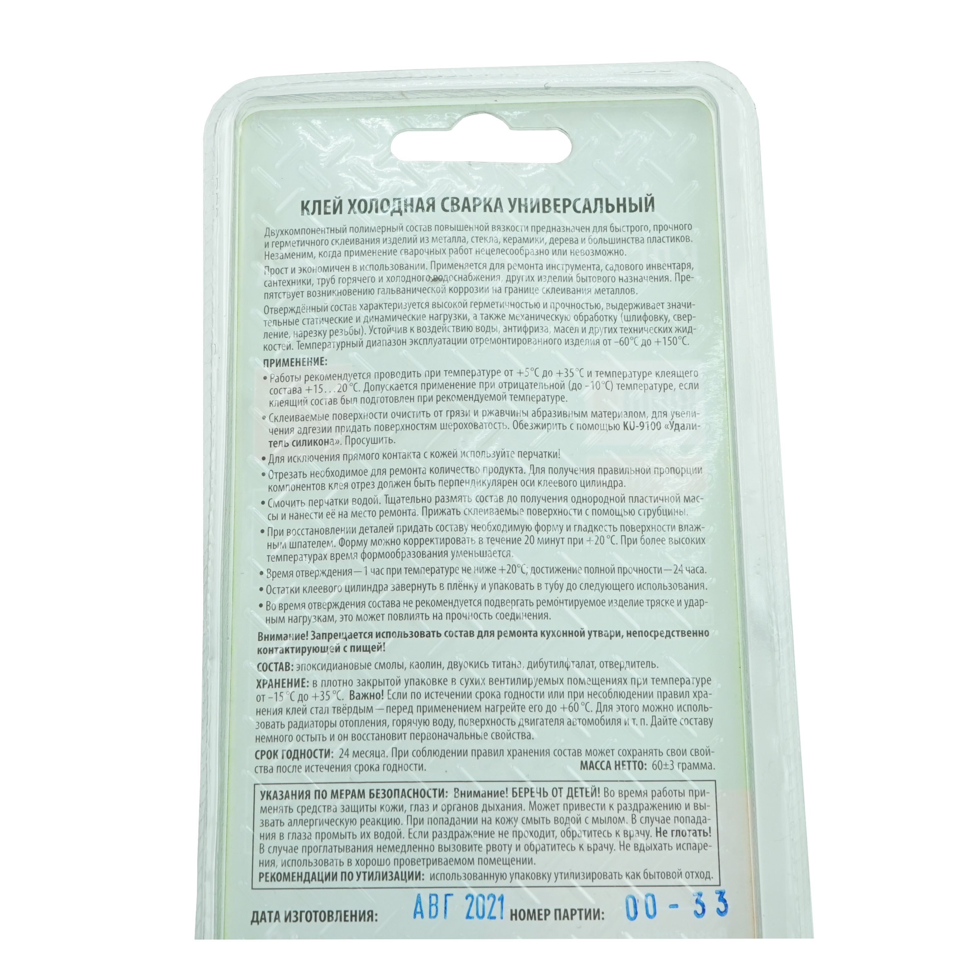 Двухкомпонентный полимерный состав повышенной вязкости предназначен для быстрого, прочного и герметичного склеивания изделий из металла, стекла, керамики, дерева и большинства пластиков. Незаменим, когда применение сварочных работ нецелесообразно или невозможно.