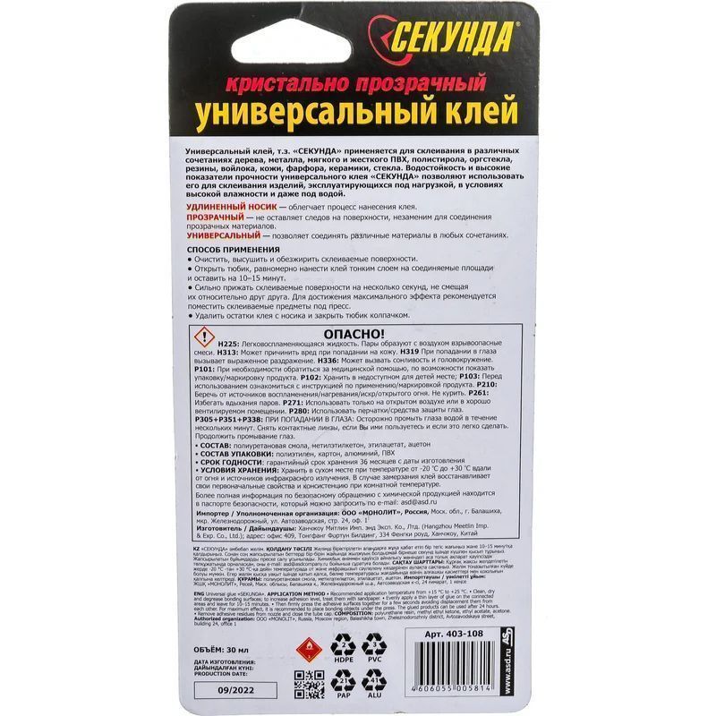 Универсальный клей Секунда 30 мл отличается влагостойкостью и термоустойчивостью, способен выдерживать температуру до 80°С.