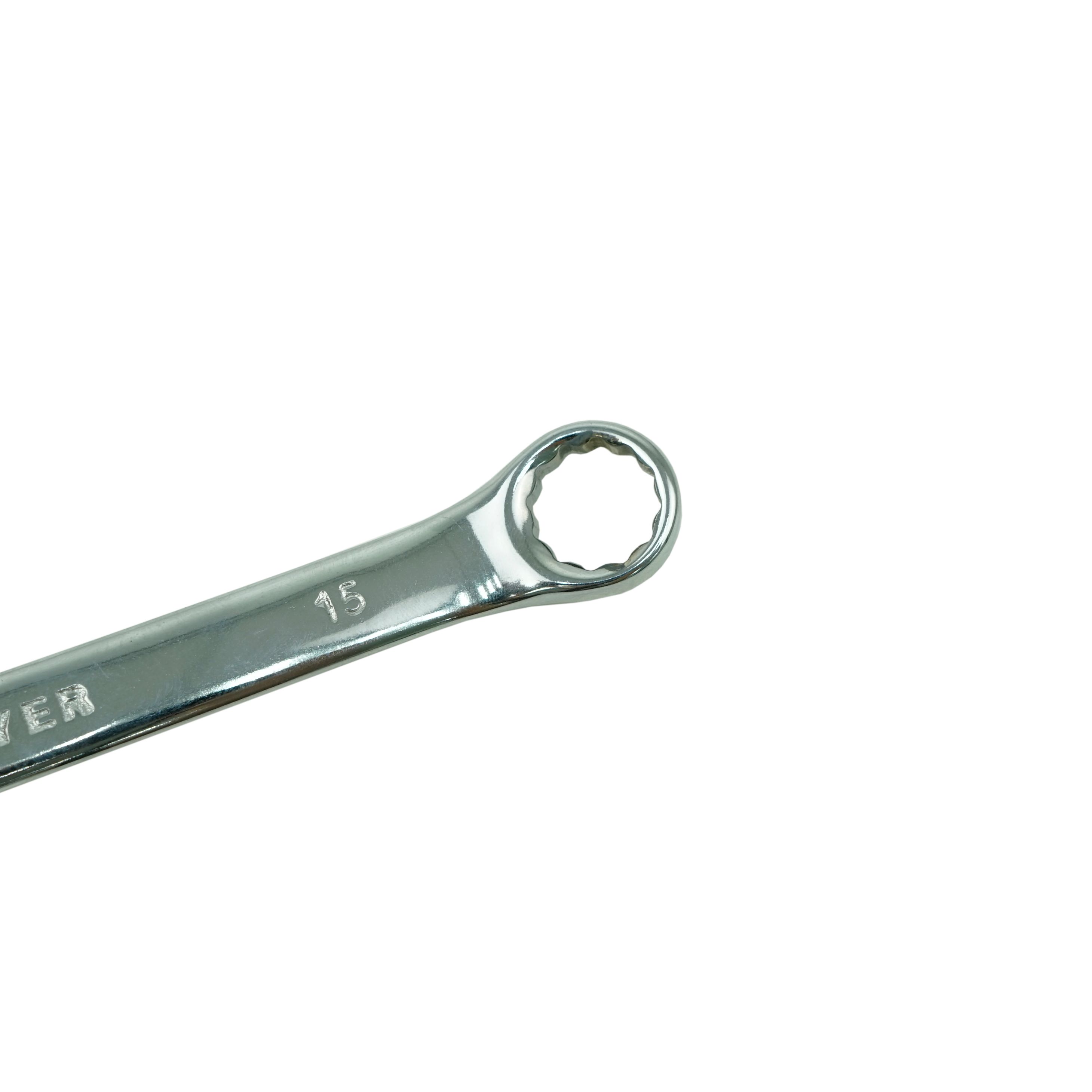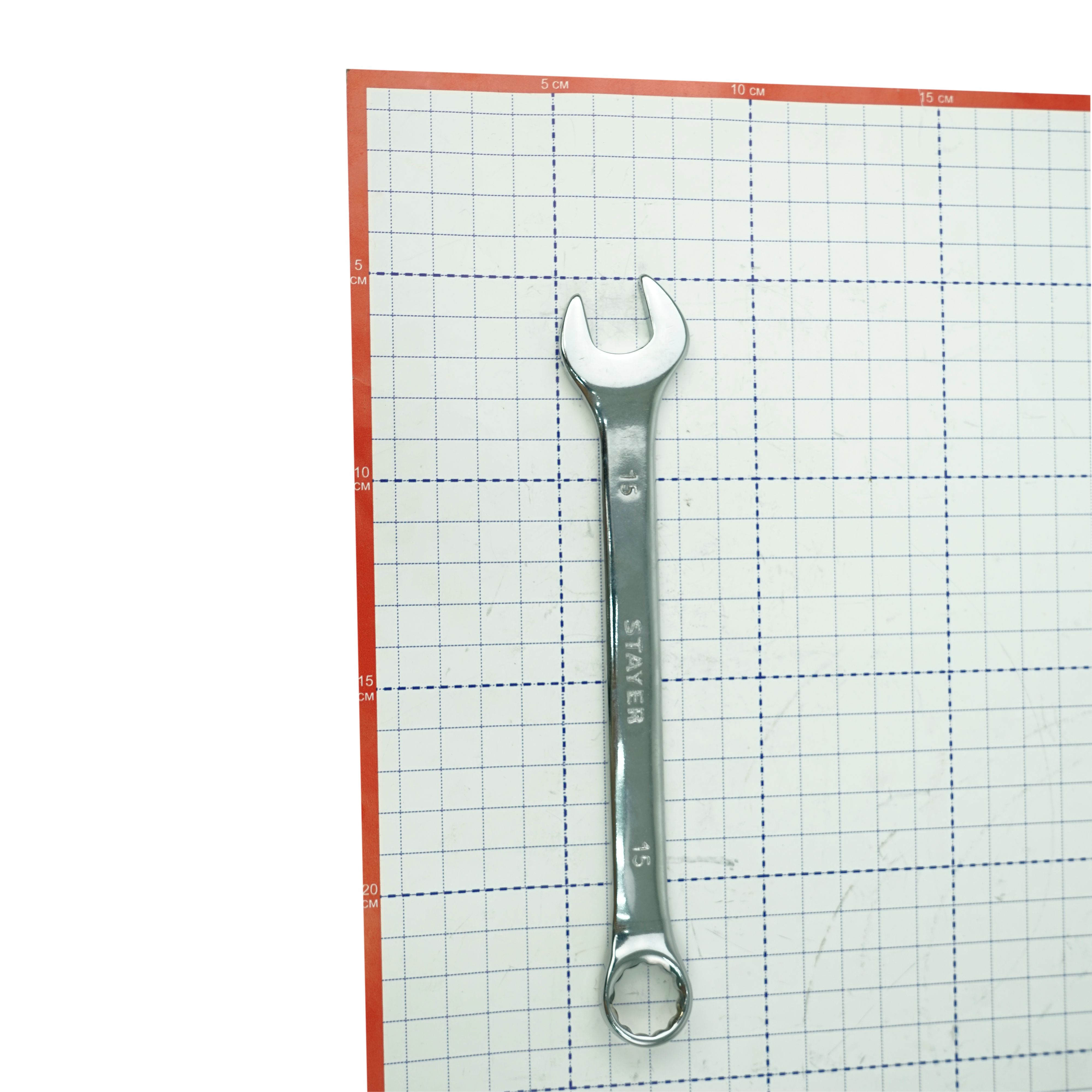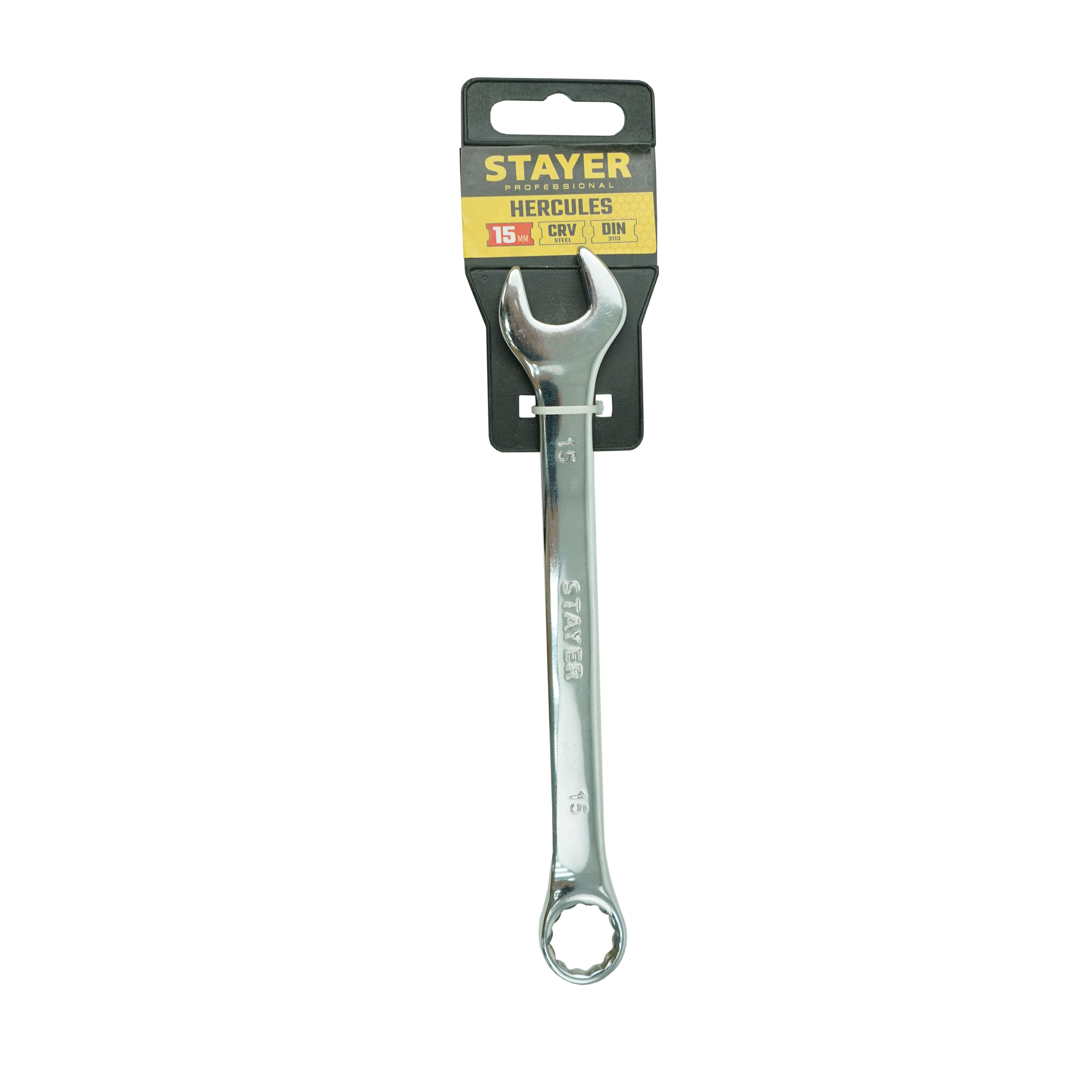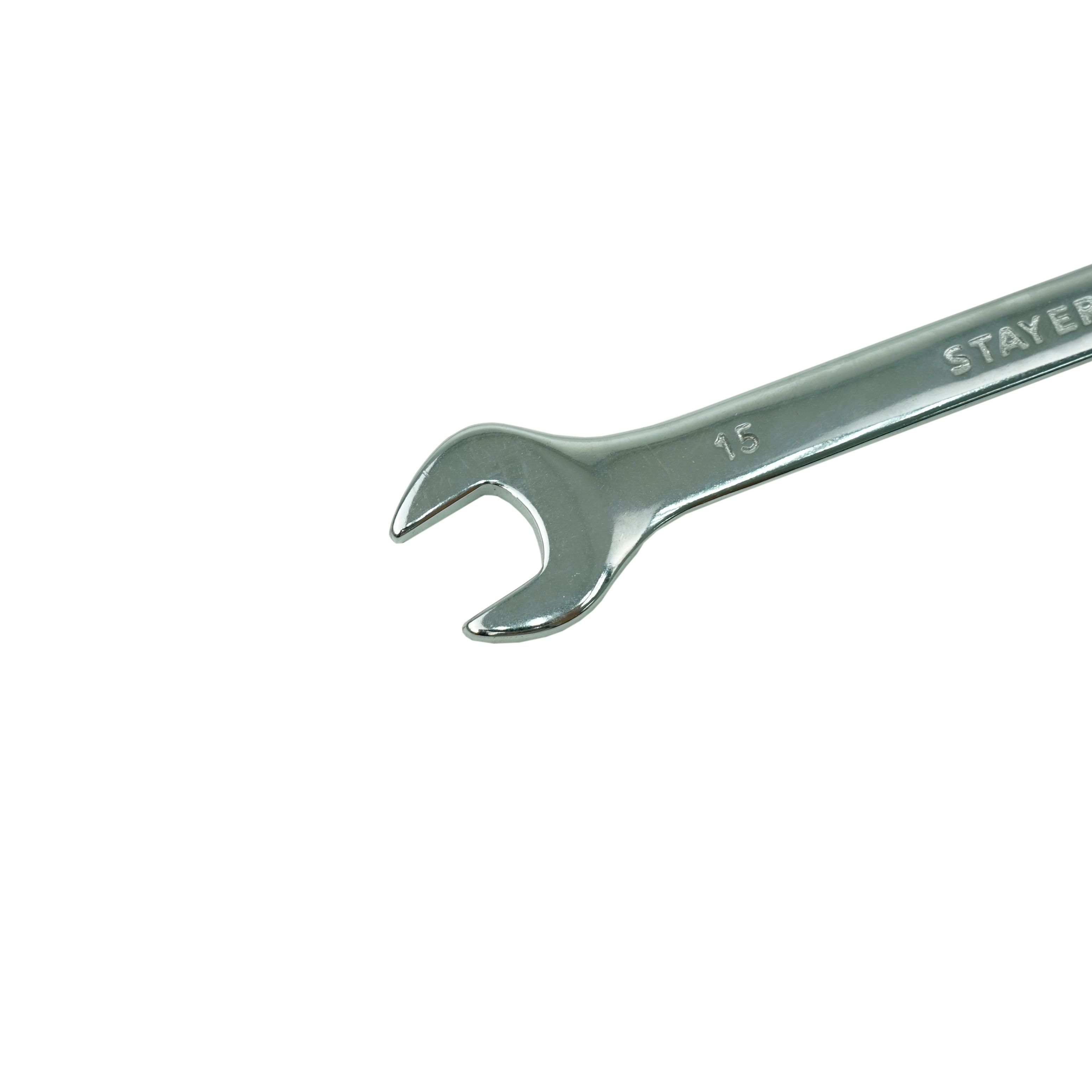 Ключ комбинированный СТАЙЕР, 15 мм - универсальный рабочий инструмент, который используется для закручивания или раскручивания элементов с резьбовым соединением. Его особенность заключается в том, что в одном литом корпусе скомбинированы две разновидности гаечных ключей: рожковый и накидной (кольцевой). Накидной зев позволяет легко ослабить или затянуть крепеж, рожковый ― увеличить скорость вращения детали.