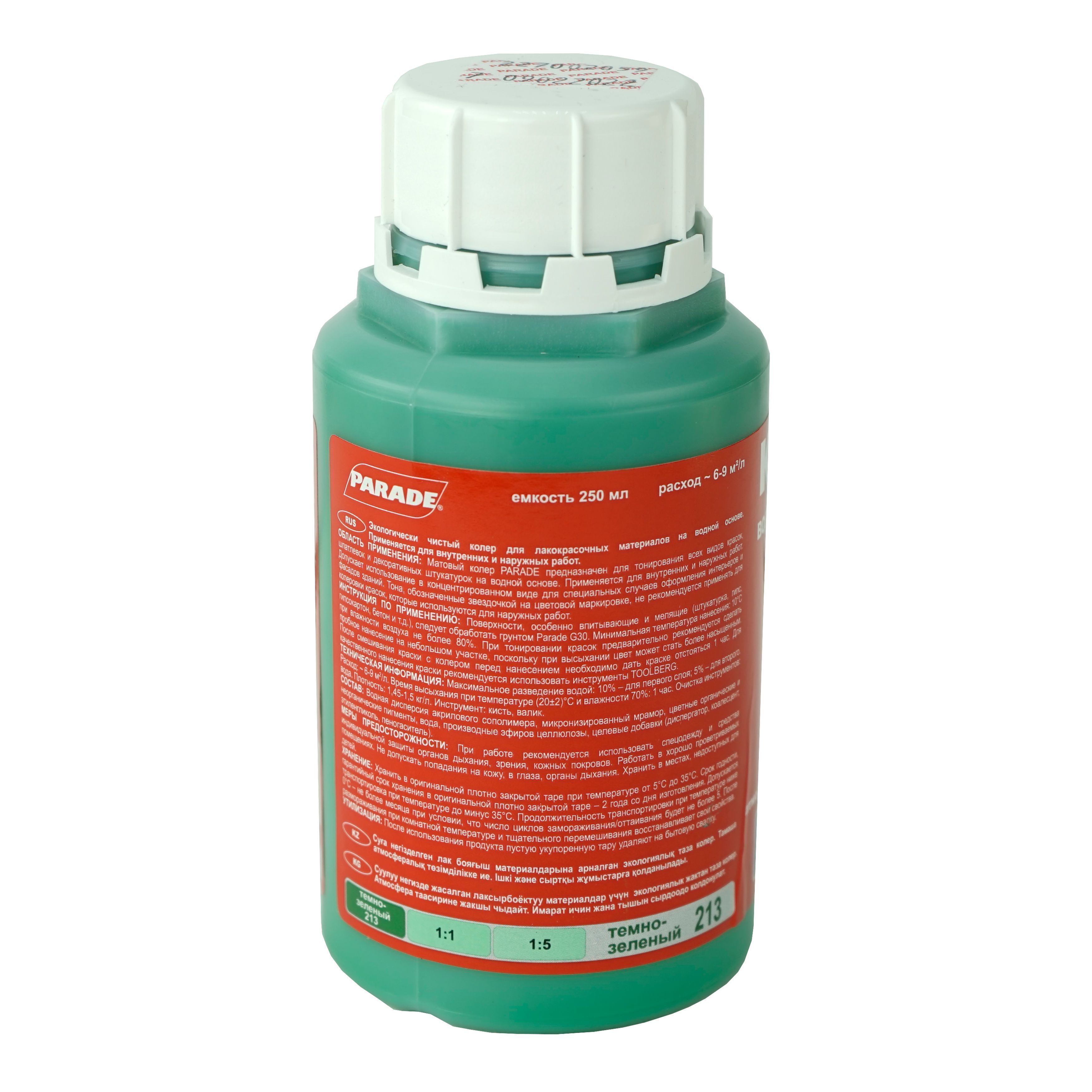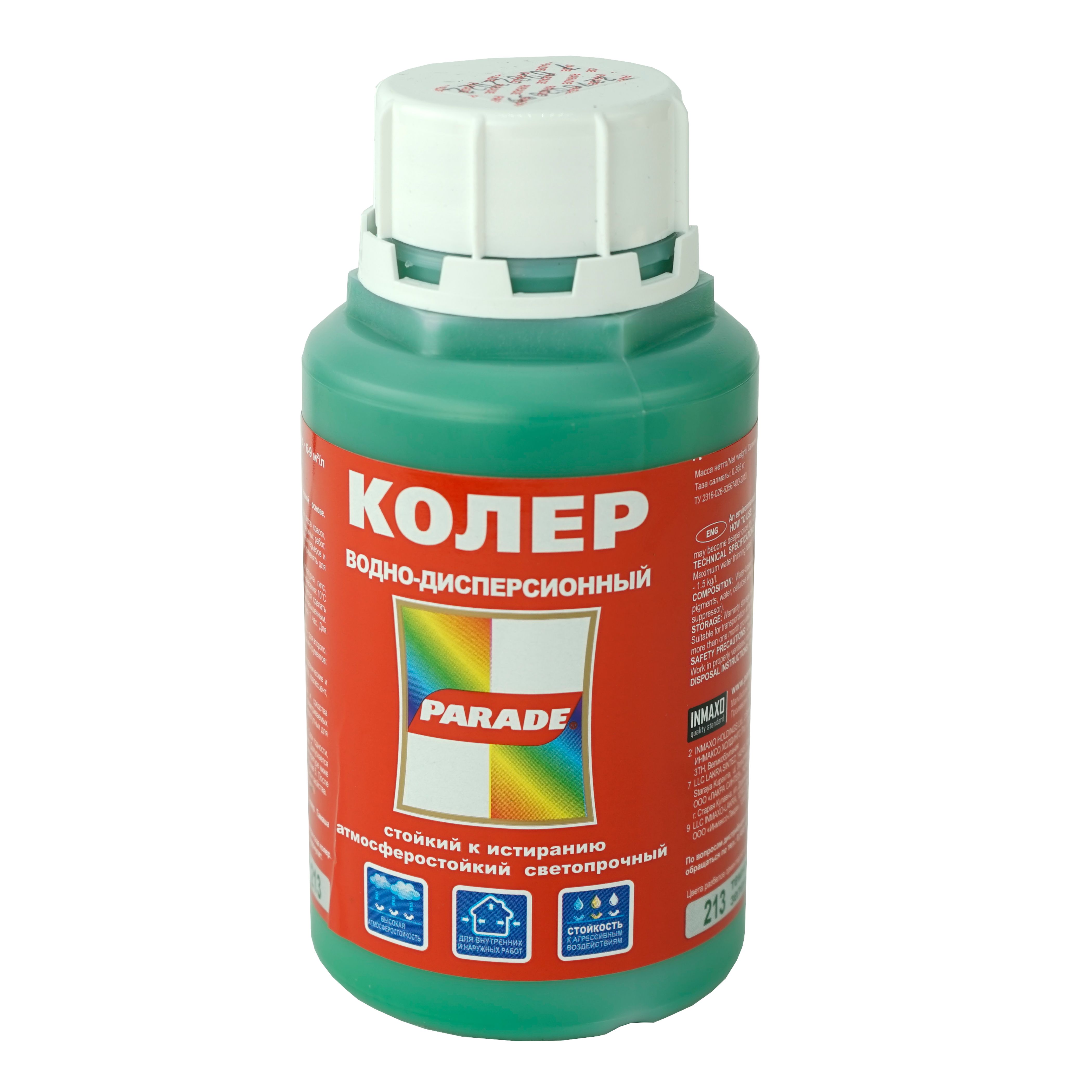 Колер-паста ПАРАД №213 Темно-зеленый, для воднодисперсионной краски 0,25л. Экологически чистый колер для лакокрасочных материалов на водной основе. Состав: Водная дисперсия акрилового сополимера.