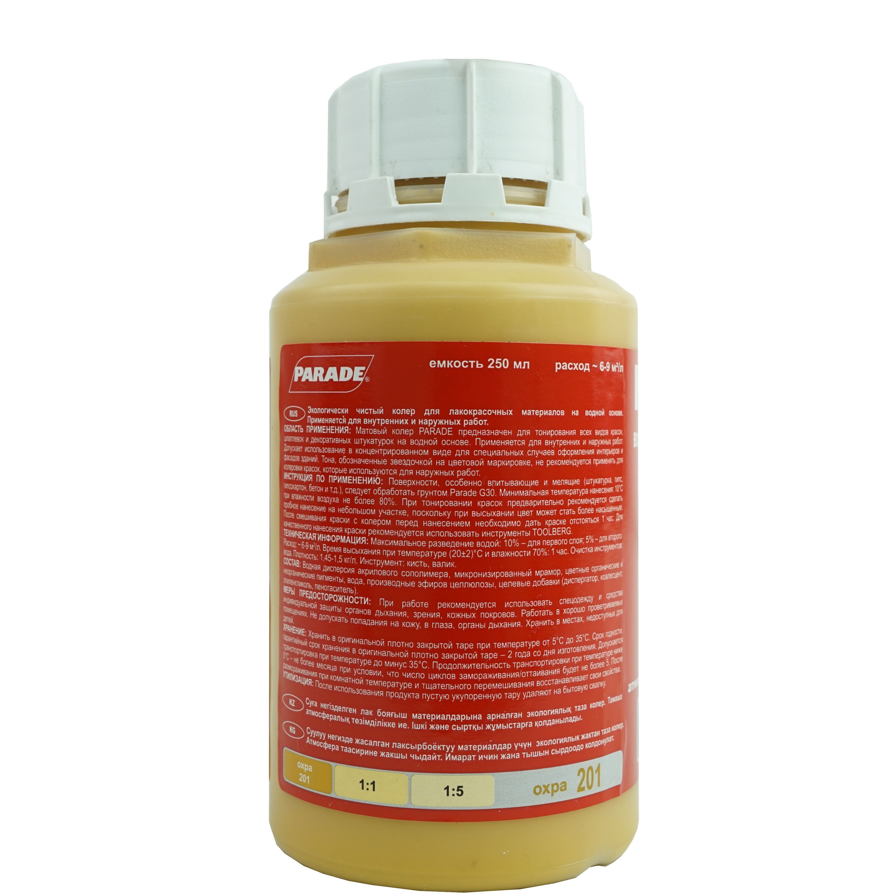 Колер-паста ПАРАД №201 Охра, для воднодисперсионной краски 0,25л. Экологически чистый колер для лакокрасочных материалов на водной основе. Состав: Водная дисперсия акрилового сополимера.