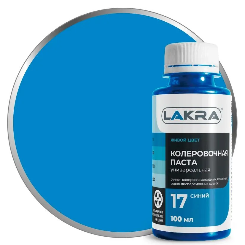 Колер-паста Лакра 17 синий, универсальная. Состав: Пигменты, наполнитель, этиленгликоль, технологические добавки (противоседиментационные, диспергатор, пеногаситель).
